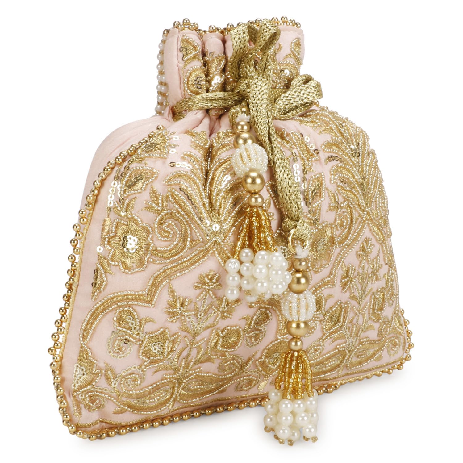 LONGING TO BUY Potli Bags with Golden Embrodiery, Polti Clutch For Wedding, Evening Function, Baby Pink, L 8" X W 1" x H 9" Inch