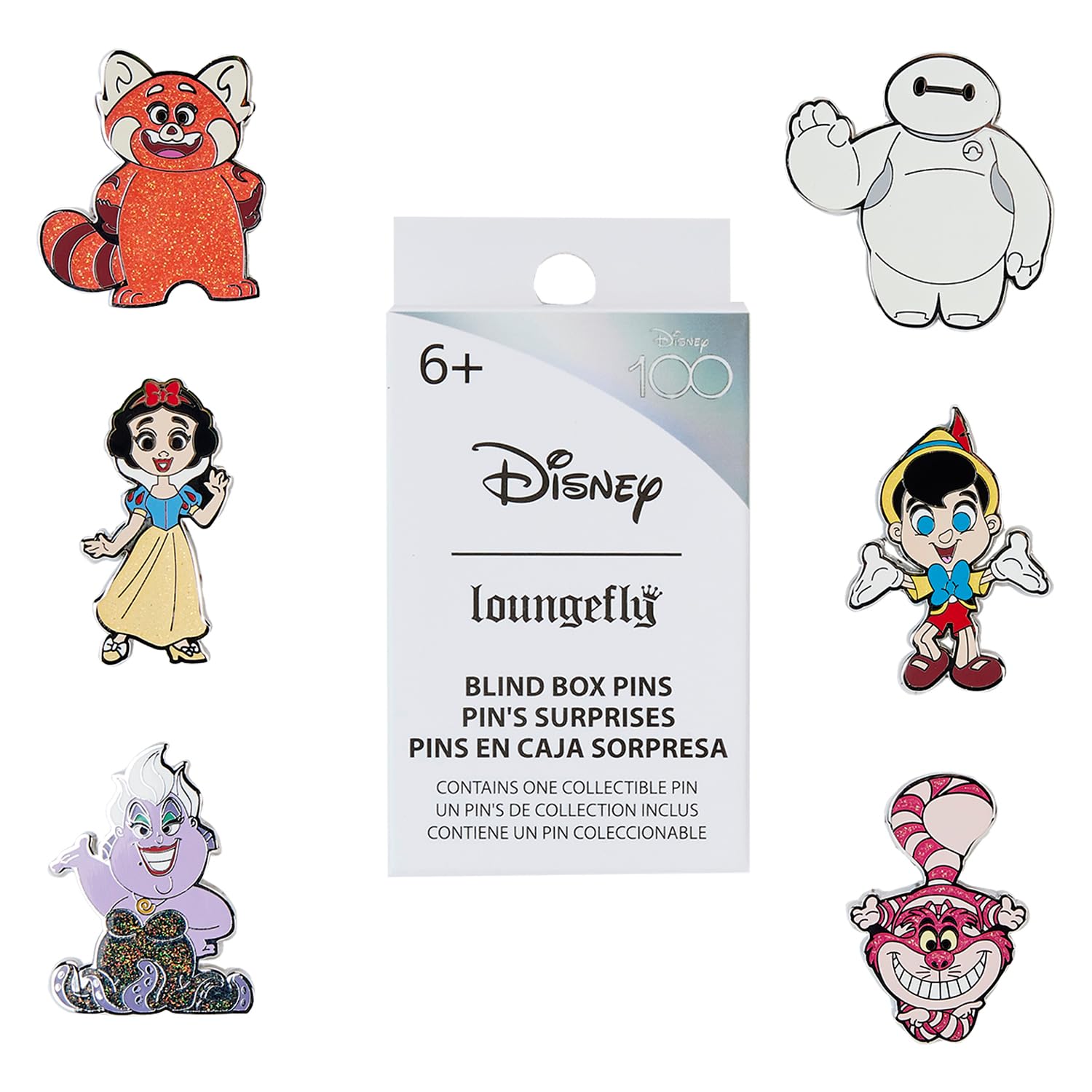 Get ready to party with your favorite friends! The Loungefly Disney100 Anniversary Mystery Box Set brings together beloved characters from the Disney and Disney-Pixar stories we know and love. Featuring exclusive artwork with glitter-filled details, this mystery pin set includes Cheshire Cat, Meilin Lee as a red panda, Snow White, Ursula, and Pinocchio. A creative addition to any pin collection, these enamel pins are perfect for Disney fans looking to keep their favorite characters close. These pins are sold individually and blind. Collect all 6. There is a 1 in 12 chance you will find a glow-in-the-dark chase Baymax variant pin. Pins are shipped at random - receiving a chaser is not guaranteed. Enamel pins are approximately 1.5-inches tall, feature gold/silver colored hardware, and the signature crown debossed pattern on the back. Please note: We cannot accept requests for specific pins. Pin selection is random, as each piece is in blind packaging. You may receive duplicate pins when ordering multiple boxes. Chaser variants are shipped at random. Receiving a chaser with purchase is not guaranteed.