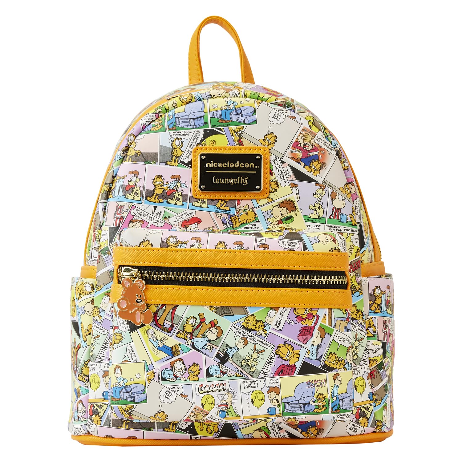 Introducing the Loungefly Garfield Comic Strip Mini Backpack - a delightful blend of style and nostalgia! Crafted from premium faux leather, this mini backpack showcases Garfield's iconic comic strip with embroidered, applique, and printed details. The interior is lined with matching themed fabric, creating a charming cohesion. Designed with both fashion and functionality in mind, this backpack is vegan-friendly and features adjustable padded shoulder straps for a comfortable fit. The hanging loop adds convenience, while the exterior side pouch pockets and zipped front pocket provide extra storage for your essentials. Bring a touch of whimsy to your everyday adventures with this Loungefly Garfield Comic Strip Mini Backpack - the perfect companion for Garfield fans on the go!