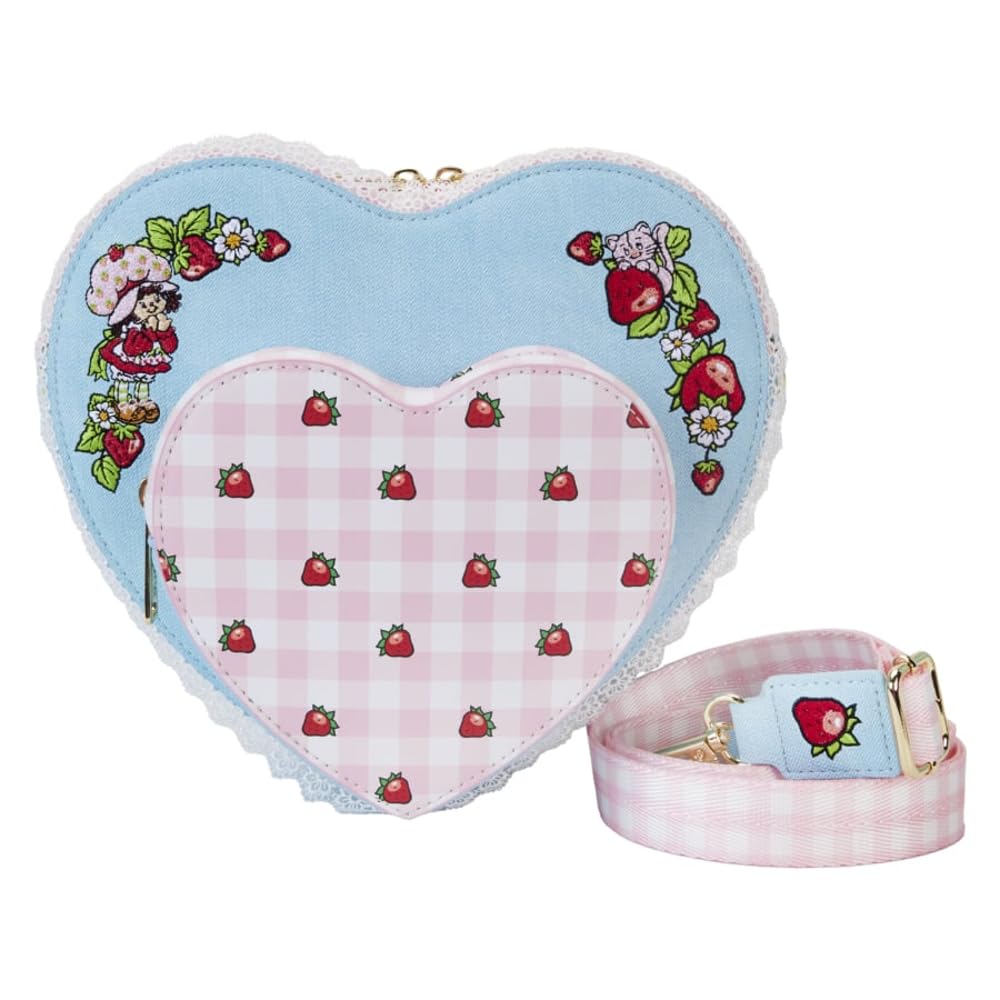 Stroll through Strawberryland looking berry sweet! Our Loungefly Strawberry Shortcake Heart Crossbody Bag is ready for some fun. The front pocket is fully figural, in the shape of a heart. A delightful pink and white gingham pattern, speckled with bright strawberries, covers the entire pocket. In the heart-shaped compartment above, a denim-like fabric, in light blue, serves as a background for Strawberry Shortcake and Custard to appear in embroidered detail. Lace trim covers the edges, and on the back, the denim material serves as a background for embroidered strawberries on vines with flowers. Removable and adjustable pink gingham straps with blue accents-and a couple more strawberries-add a touch of fun. Secure just what you need for the day in this handy bag and celebrate Strawberry Shortcake’s 45th anniversary in a berry fashionable way. The Loungefly Strawberry Shortcake Heart Crossbody Bag is made of vegan leather (polyurethane). Bag has an adjustable, removable strap and sturdy gold-colored metal hardware. Additional features include embroidered, lace, scented, and printed details.