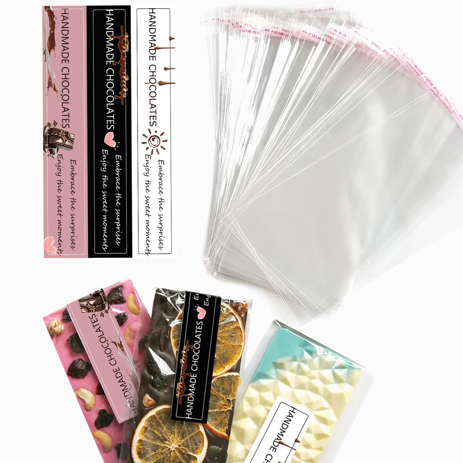 190Pcs Chocolate Bar Packaging Wrappers Stickers Set,100pcs 4"*7.9" Cellophane Clear Self Adhesive Bags and 90pcs Chocolate Stickers for DIY Chocolate Lover Small Batched Custom