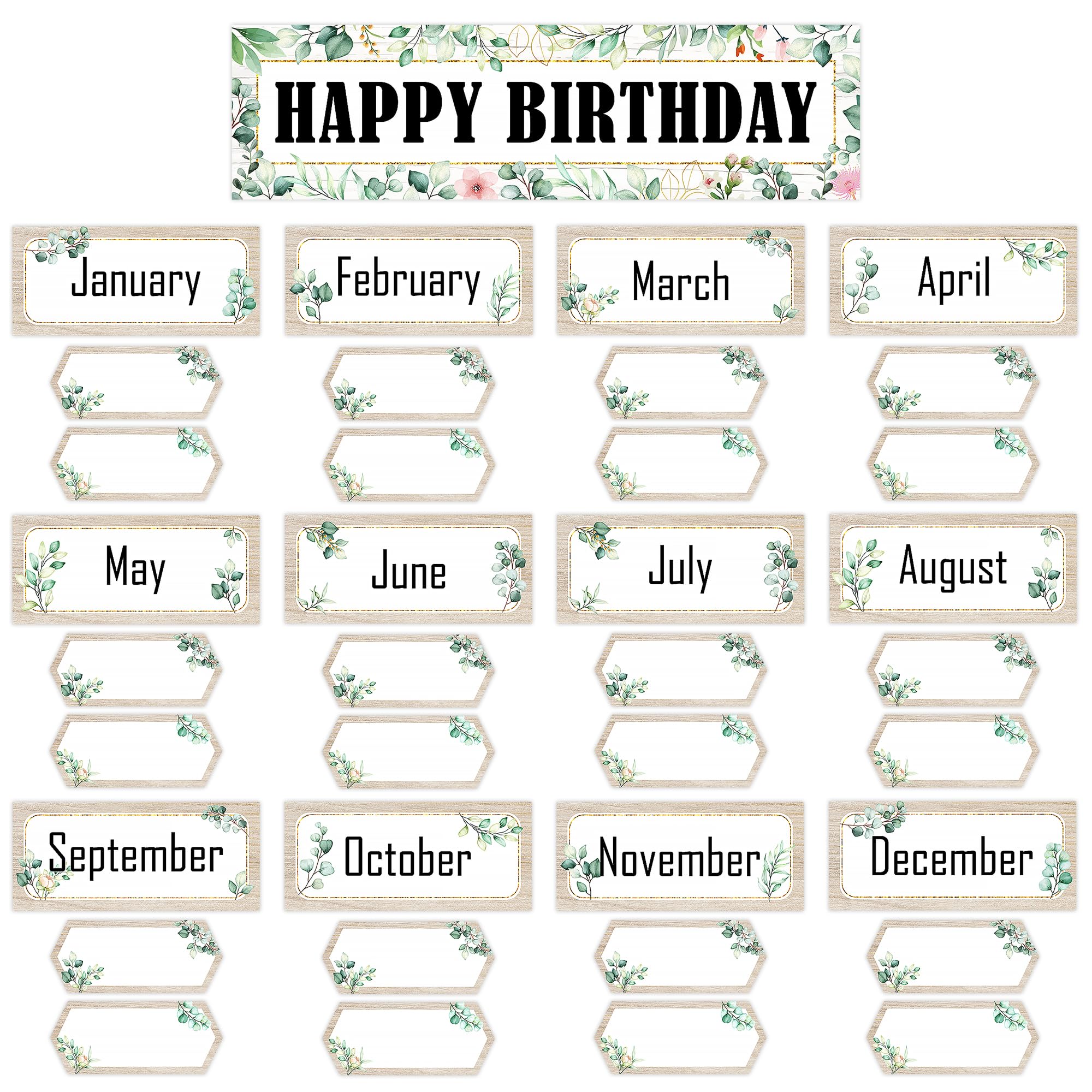 Lucleag 53 PCS Eucalyptus Birthday Cutouts for Bulletin Board Decorations, Classroom Happy Birthday Chart Name Plates Set for Wall Bulletin Board Decoration Back to School Supplies