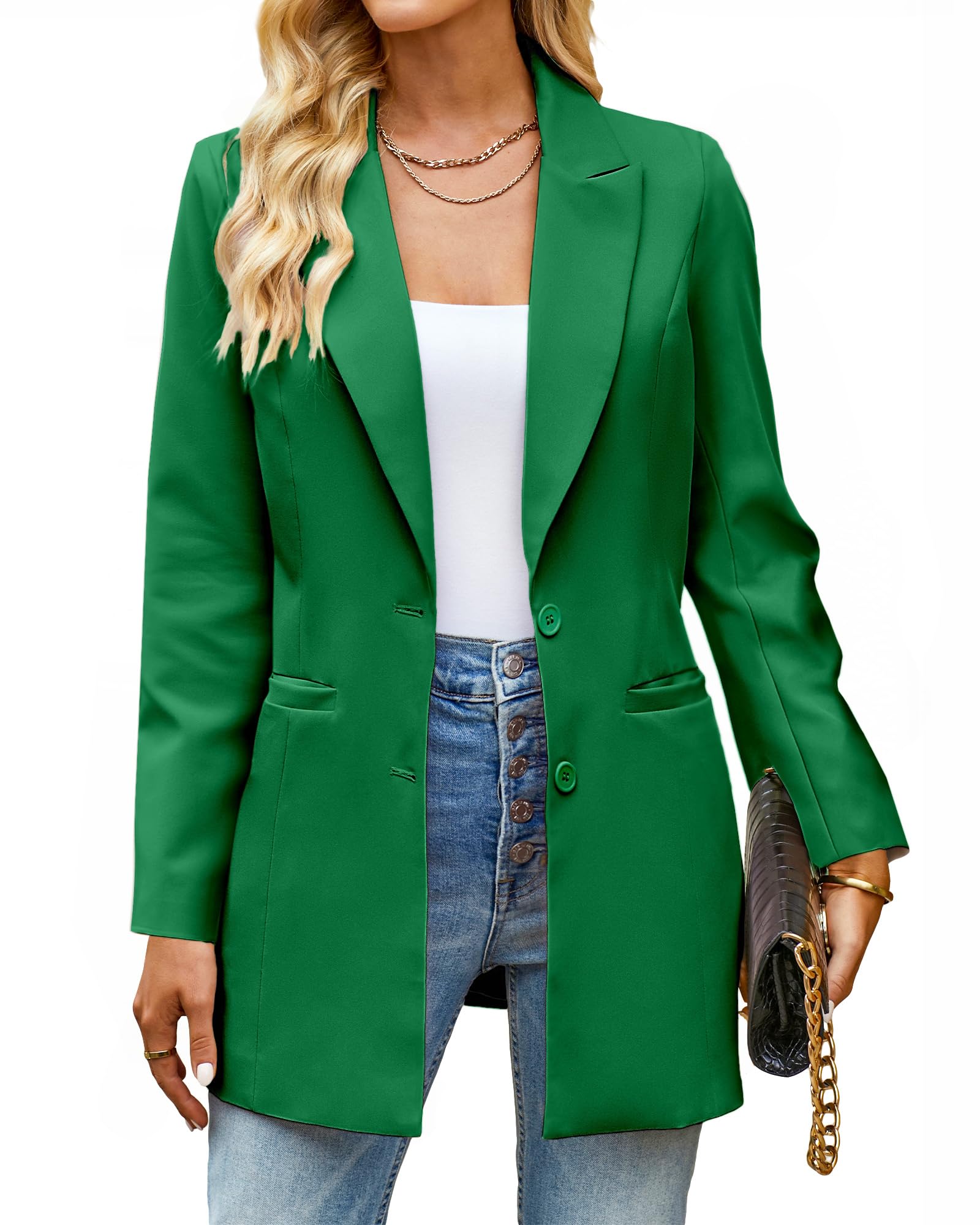 luvamia 2024 Blazers for Women Business Casual Long Blazer Jackets Dressy Work Professional Office Outfits Lapel Pockets Summer Blazers for Women Lightweight Kelly Green Size Large Size 12 Size 14