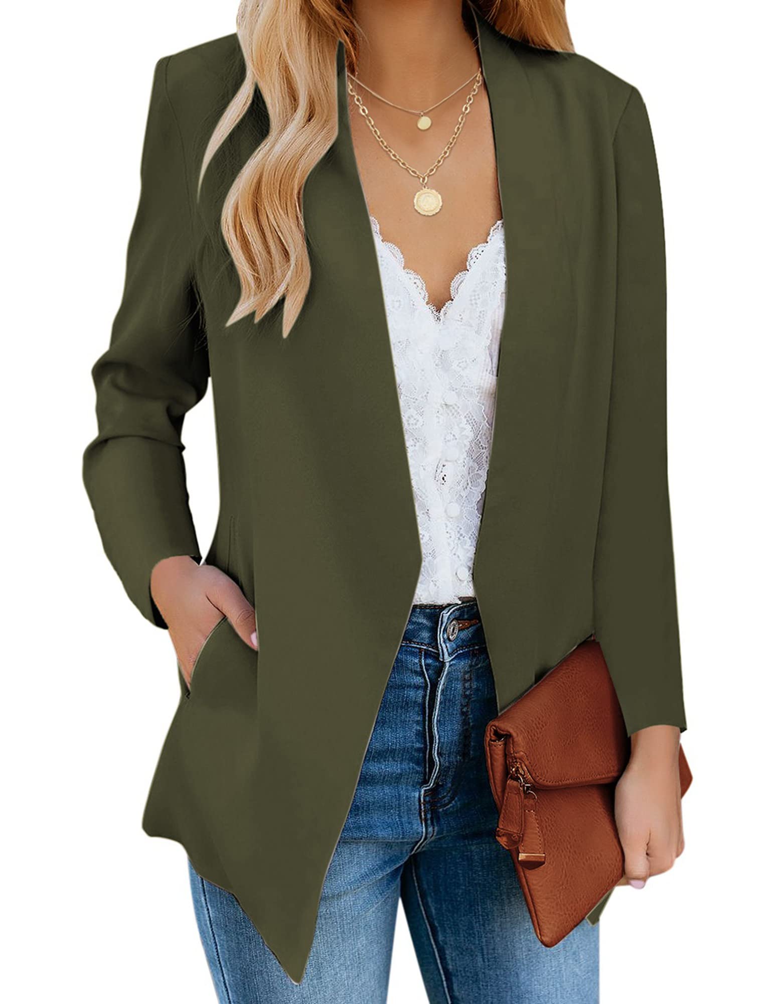 Features a notched lapel style, turn down collar, open front, one button closue in front, solid color blazer jacket with pockets.