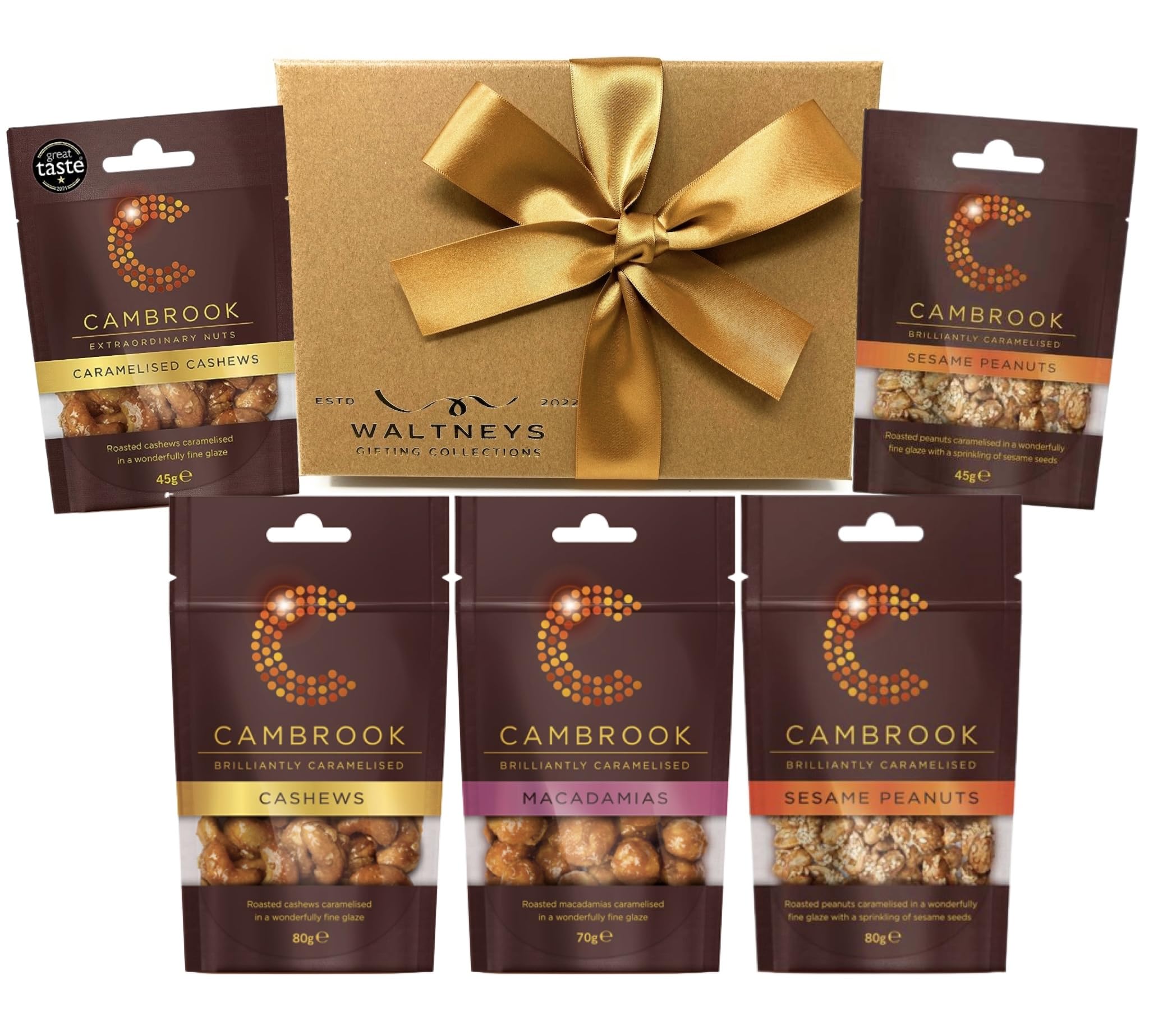 Introducing our exquisite Luxury Nuts and Snacks Hamper Gift Set - a symphony of flavors and elegance that promises an unforgettable tasting experience. Featuring a trio of taste sensations: Caramelised Macadamias (1 x 70g), Caramelised Cashews (1 x 80g, 1 x 45g), and Caramelised Peanuts with Sesame Seeds (1 x 80g, 1 x 45g).