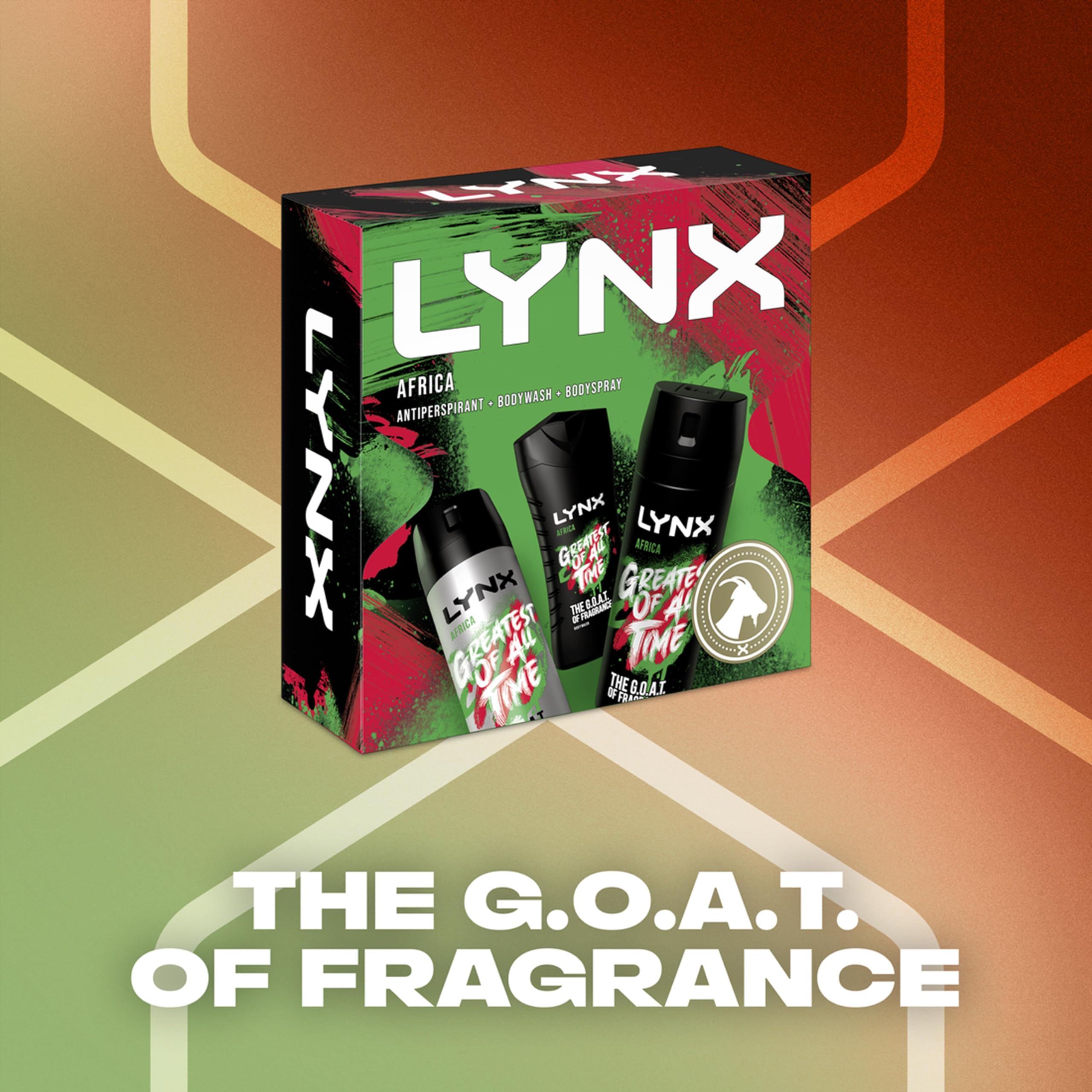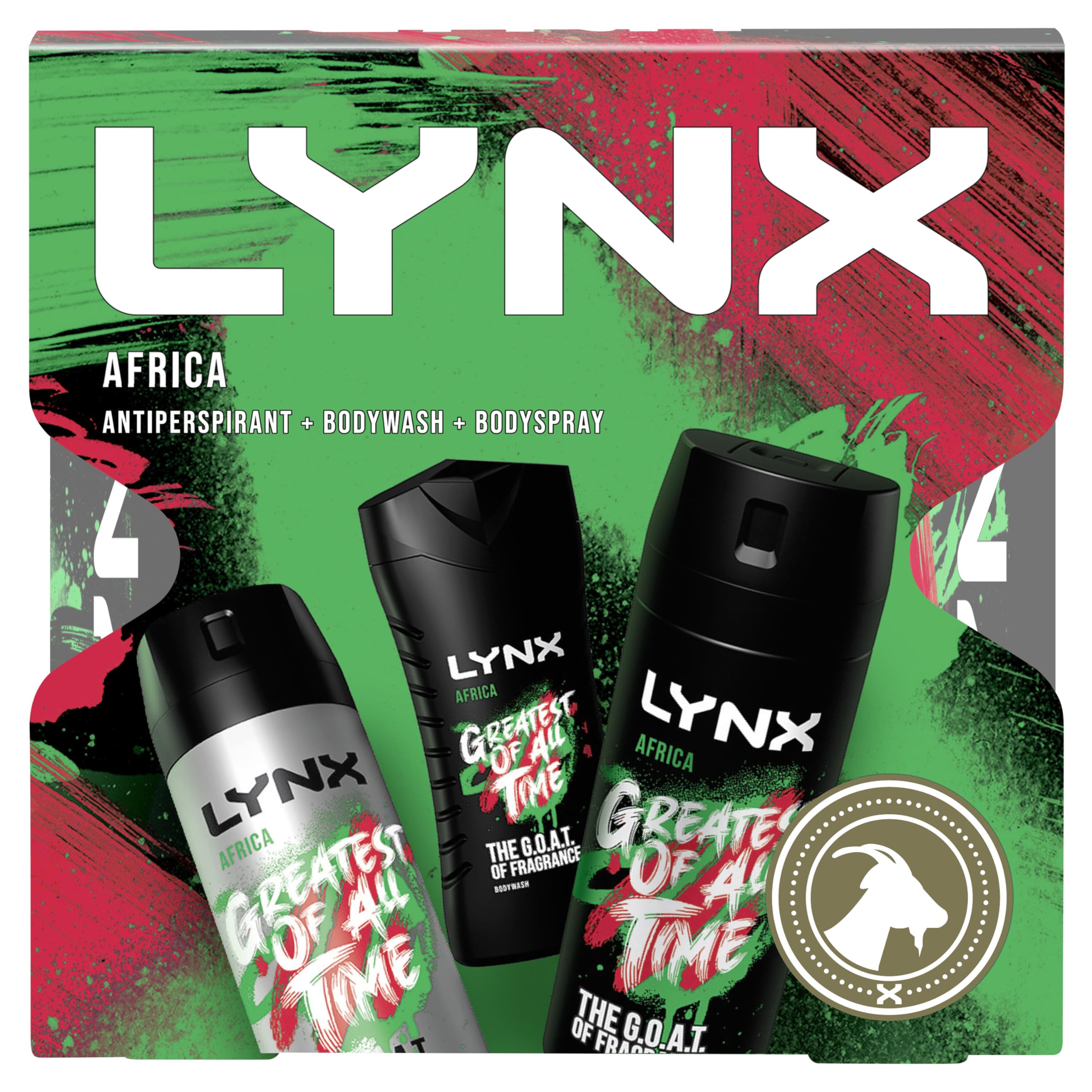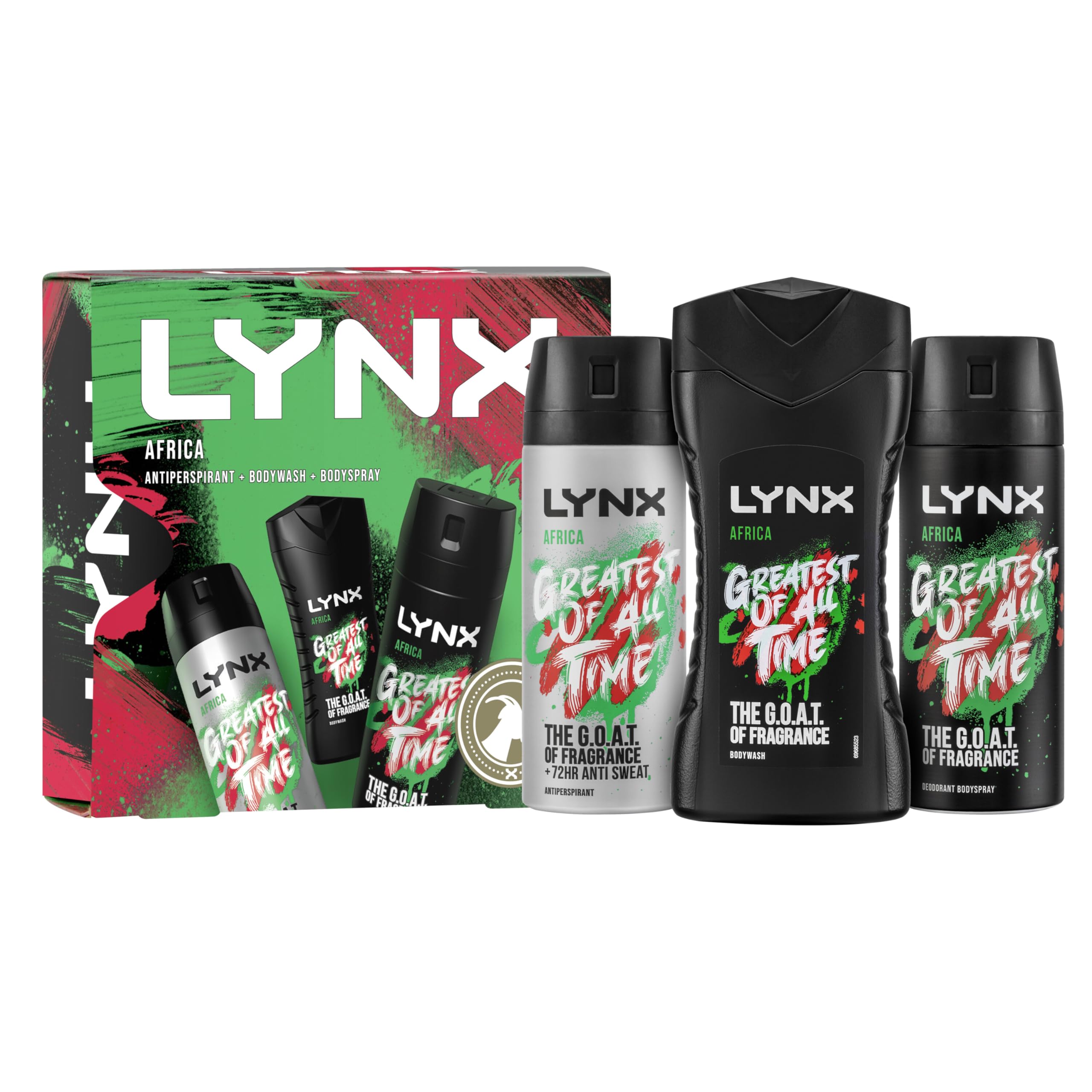 So, it’s gift-giving time again. The age-old question: ‘What will I get him?’ Relax. The answer’s simple. Time to take the guesswork out of getting it right and grab the LYNX Africa Trio Gift Set. Son, brother, husband, dad, uncle, cousin... whoever he is, whatever the occasion, there’ll be no fake happiness when he unwraps this bad boy. Trust us. Teaming full-size LYNX Africa Body Wash, Body Spray and Anti-Perspirant Deodorant together, this set of gifts for him has got him covered with the greatest fragrance of all time, featuring squeezed mandarin and sandalwood notes. The shower gel helps him kick-start his day with a powerful blast of spicy freshness and leaves him feeling clean and smelling 100% irresistible for up to 12 hours. Plus, it contains 100% plant-based moisturisers for naturally soft skin. The body spray features our revolutionary dual-action technology that fights odour-causing bacteria to help him bust odour and smell iconic for 48 hours. Developed using our unique pro-scent technology, the anti-perspirant deodorant guarantees up to 72 hours of dryness and freshness, protecting against wetness and body odour before they even start. Packaged and ready to gift in a box, these gifts for him will help him stay at the top of his game and have the confidence to be the best version of the only thing he can be: himself. *Kantar Usage, GB Male Deodorant & Shower % Weekly Occasions. June 2018-2022.IngredientsLYNX AFRICA BODYSPRAY G.O.A.T.150ML Ingredients: Alcohol Denat., Butane, Isobutane, Propane, Parfum, Zinc Neodecanoate, Isopropyl Myristate, Citronellol, Coumarin, Geraniol, Hexyl Cinnamal, Linalool. LYNX AFRICA BODYWASH G.O.A.T 225ML Ingredients: Aqua, Sodium Laureth Sulfate, Glycerin, Sodium Chloride, Cocamidopropyl Betaine, Parfum, Sodium Benzoate, Citric Acid, Lactic Acid, Disodium EDTA, PPG-6, Saccharide Isomerate, Citronellol, Coumarin, Hexyl Cinnamal, Limonene, Linalool, CI 19140, CI 42090. LYNX AFRICA ANTIPERSPIRANT G.O.A.T 150ML Ingredients: Butane, Isobutane, Propane, PPG-14 Butyl Ether, Aluminum Sesquichlorohydrate, Cyclopentasiloxane, Parfum, Glycine, Helianthus Annuus Seed Oil, C12-15 Alkyl Benzoate, Disteardimonium Hectorite, Calcium Chloride, Octyldodecanol, BHT, Propylene Carbonate, Dimethiconol, Benzyl Alcohol, Benzyl Salicylate, Citronellol, Coumarin, Geraniol, Linalool.DirectionsUse body wash with water on the body, lather and rinse off. Spray body spray and antiperspirant deodorant on the body as needed.