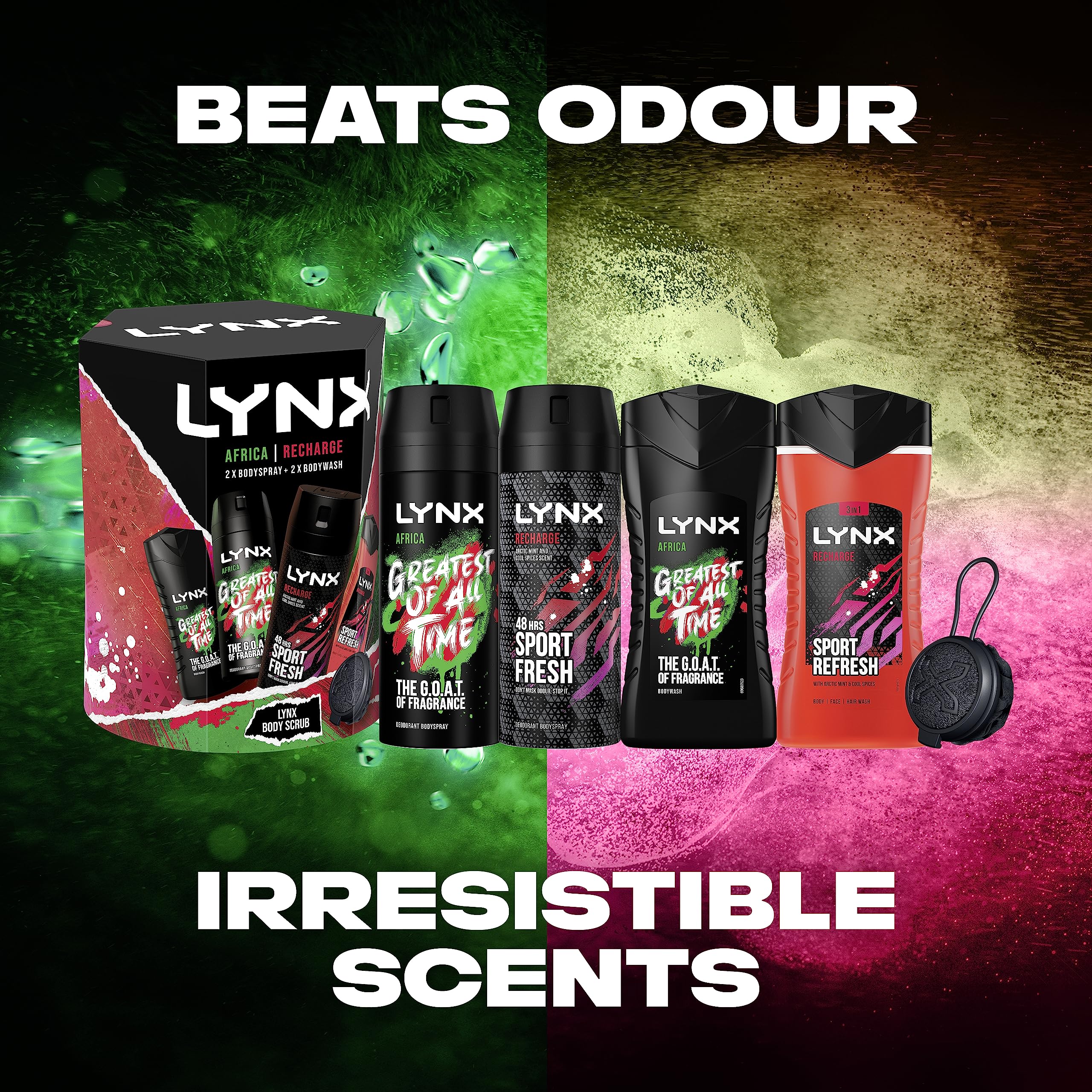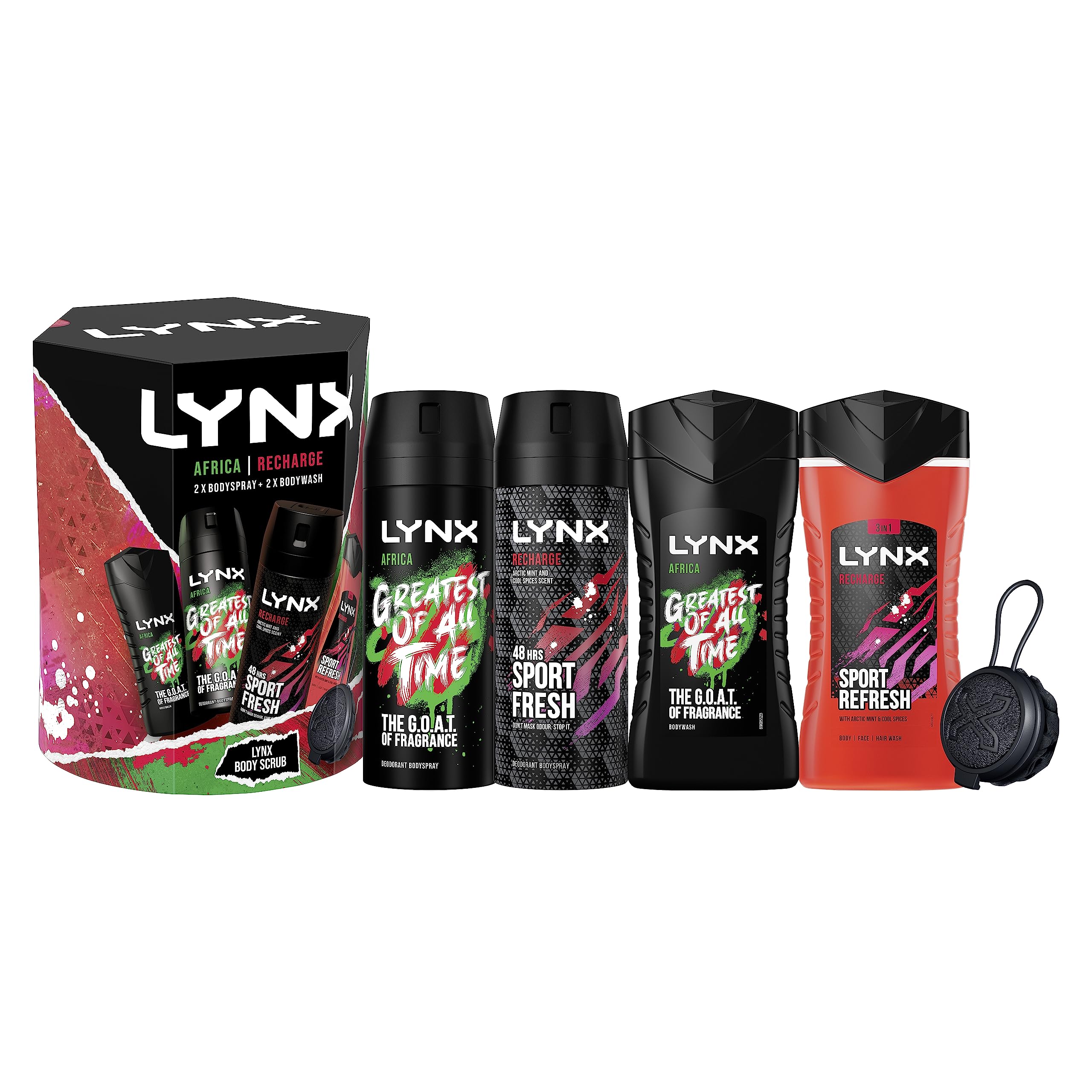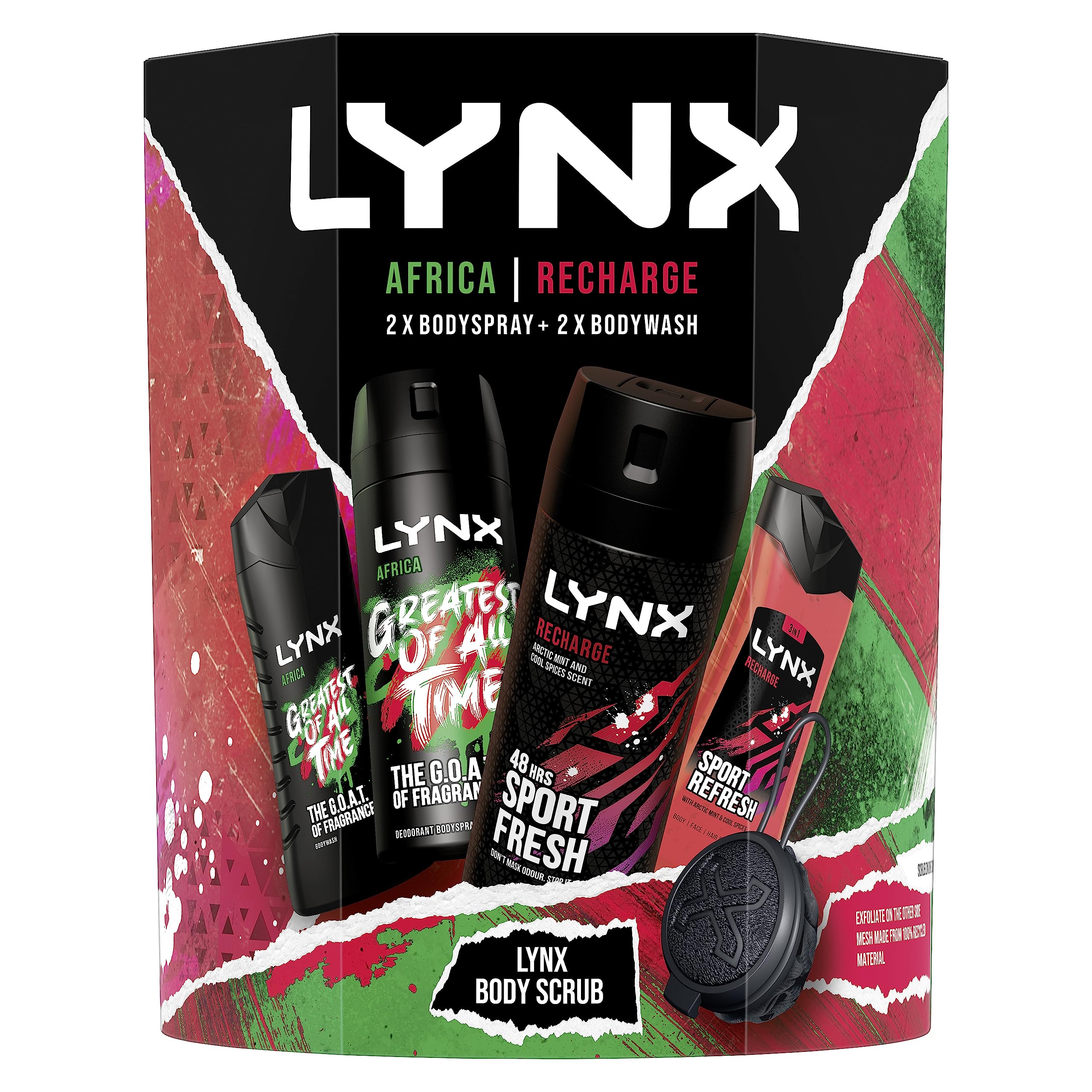 So, it’s gift-giving time again. The age-old question: ‘What will I get him?’ Relax. The answer’s simple. The legendary LYNX Recharge & Africa Bumper Pack Gift Set with a dual-sided shower tool to help him power through his next shower the LYNX way. An absolute winner of a gift, featuring four gifts for him in two irresistible scents to help him kick-start his day with a powerful blast of spicy freshness. A captivating combo of confidence-boosting fragrances that says, ‘Yep, you’ve nailed it.’ Son, brother, husband, dad, uncle, cousin... Whoever you’re buying for, there’ll be no fake smiles when he unwraps this bad boy. Trust us. The Recharge and Africa deodorant body sprays use our revolutionary dual-action technology to fight odour-causing bacteria, helping him bust odour and smell incredible for 48 hours. LYNX Recharge and Africa body washes kick odour to the kerb, leaving him in control and confident with 12 hours of freshness. Plus, they contain 100% plant-based moisturisers for naturally soft and silky skin. With two scrubbing options, the body scrubber shower tool helps him lather up - a soft mesh side for more sensitive areas, and a tougher scrub side to remove dead skin from rough spots like elbows and heels. Packaged and ready-to-gift in a box, this body scrubber, body wash and body spray combo will help him to stay at the top of his game and have the confidence to be the best version of the only thing he can be: himself.IngredientsLYNX RECHARGE BODYSPRAY 150ML Ingredients: Alcohol Denat., Butane, Isobutane, Propane, Parfum, Zinc Neodecanoate, Isopropyl Myristate, Benzyl Alcohol, Benzyl Salicylate, Citral, Coumarin, Eugenol, Hexyl Cinnamal, Limonene, Linalool. LYNX RECHARGE BODYWASH 225ML Ingredients: Aqua, Sodium Laureth Sulfate, Glycerin, Cocamidopropyl Betaine, Sodium Chloride, Parfum, Sodium Benzoate, Citric Acid, Menthol, Lactic Acid, Disodium EDTA, PPG-6, Saccharide Isomerate, Benzyl Salicylate, Limonene, Linalool, CI 17200, CI 19140. LYNX AFRICA BODYSPRAY G.O.A.T.150ML Ingredients: Alcohol Denat., Butane, Isobutane, Propane, Parfum, Zinc Neodecanoate, Isopropyl Myristate, Citronellol, Coumarin, Geraniol, Hexyl Cinnamal, Linalool. LYNX AFRICA BODYWASH G.O.A.T 225ML Ingredients: Aqua, Sodium Laureth Sulfate, Glycerin, Sodium Chloride, Cocamidopropyl Betaine, Parfum, Sodium Benzoate, Citric Acid, Lactic Acid, Disodium EDTA, PPG-6, Saccharide Isomerate, Citronellol, Coumarin, Hexyl Cinnamal, Limonene, Linalool, CI 19140, CI 42090.