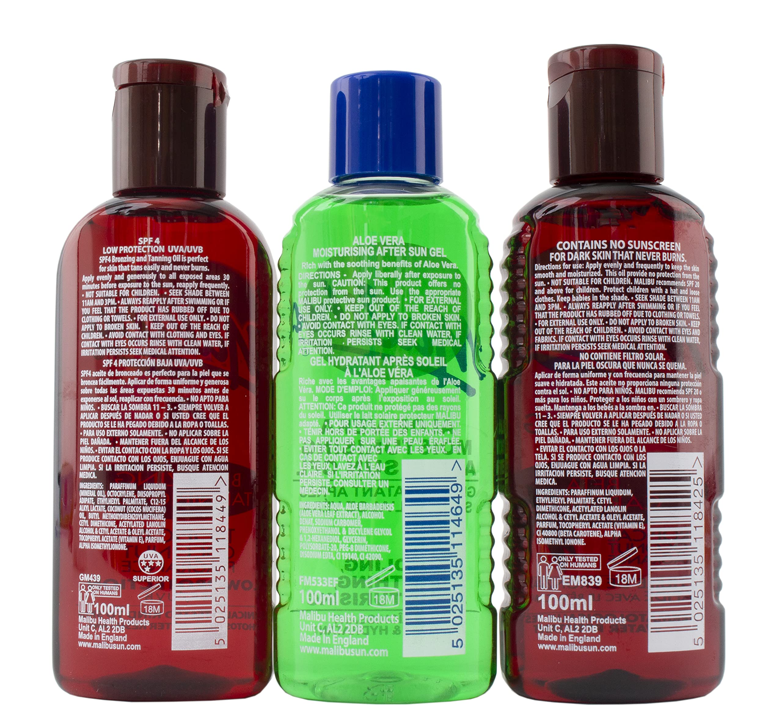 For over 20 years, Malibu has been creating quality and affordable 'sun protection for every body'. Our comprehensive range of formulas and SPFs suit all ages and skin requirements. Malibu Sun SPF 4 Low Protection Bronzing Oil is specially formulated to protect and moisturise your skin before sun exposure. Malibu Sun Fast-Tanning Oil with Beta Carotene aids the skin’s tanning process. Malibu Sun After Sun gel is rich in Aloe vera making it the perfect relief for dry sun-burnt skin. Each one of our bottles are made in England and clinically proven to be kind to skin and only ever tested on humans.Directions: Tanning Oil: Squeeze oil onto skin. Apply lotion 30 minutes before and frequently during sun exposure. Ensure that all skin is evenly and generously covered. Reapply after prolonged swimming and if rubbed off by towel or clothing. After Sun Gel: Squeeze after-sun gel onto hand. Apply liberally after exposure to the sun, ensuring you get a full-even coverage.Cautions: for external use only. Do not apply to broken skin. Keep out of the reach of children. Avoid contact with fabrics and eyes. If contact with eyes occurs, rinse with clean water. If irritation persists, seek medical attention.Malibu recommends SPF 30 and above for children. Protect children with a hat and loose clothes. Keep babies in shade. Seek shade between 11am and 3pm. "Every one’s skin is different and the sun varies in intensity - take care in the sun to avoid over exposure."IngredientsParaffinum Liquidum, Ethylhexyl Palmitate, Cetyl Dimethicone, Cetyl Acetate & Stearyl Acetate & Oleyl Acetate & Acetylated Lanolin Alcohol, Ci 40800 (Beta Carotene), Parfum, Tocopheryl Acetate (Vitamin E), Alpha Isomethylionone. Paraffinum Liquidum, Octocrylene, Diisopropyl Adipate, Ethylhexyl Palmitate, Butyl Methoxydibenzoylmethane, C12-15 Alkyl Lactate, Cetyl Dimethicone, Cetyl Acetate & Stearyl Acetate & Oleyl Acetate & Acetylated Lanolin Alcohol, Tocopheryl Acetate (Vitamin E), Parfum, Alpha Isomethylionone. Aqua (Water), Aloe Barbadensis (Aloe Vera Leaf Extract), Alcohol (Denat.), Sodium Carbomer, Phenoxyethanol & Decylene Glycol & 1,2-Hexanediol, Glycerine, Polysorbate 20, Peg-8 Dimethicone, Disodium Edta, Ci. 19140, Ci. 42090.DirectionsDirections: Tanning Oil: Squeeze oil onto skin. Apply lotion 30 minutes before and frequently during sun exposure. Ensure that all skin is evenly and generously covered. Reapply after prolonged swimming and if rubbed off by towel or clothing. After Sun Gel: Squeeze after-sun gel onto hand. Apply liberally after exposure to the sun, ensuring you get a full-even coverage. Cautions: for external use only. Do not apply to broken skin. Keep out of the reach of children. Avoid contact with fabrics and eyes. If contact with eyes occurs, rinse with clean water. If irritation persists, seek medical attention. Malibu recommends SPF 30 and above for children. Protect children with a hat and loose clothes. Keep babies in shade. Seek shade between 11am and 3pm. "Every one’s skin is different and the sun varies in intensity - take care in the sun to avoid over exposure."Safety WarningCautions: for external use only. Do not apply to broken skin. Keep out of the reach of children. Avoid contact with fabrics and eyes. If contact with eyes occurs, rinse with clean water. If irritation persists, seek medical attention. Malibu recommends SPF 30 and above for children. Protect children with a hat and loose clothes. Keep babies in shade. Seek shade between 11am and 3pm. "Every one’s skin is different and the sun varies in intensity - take care in the sun to avoid over exposure."