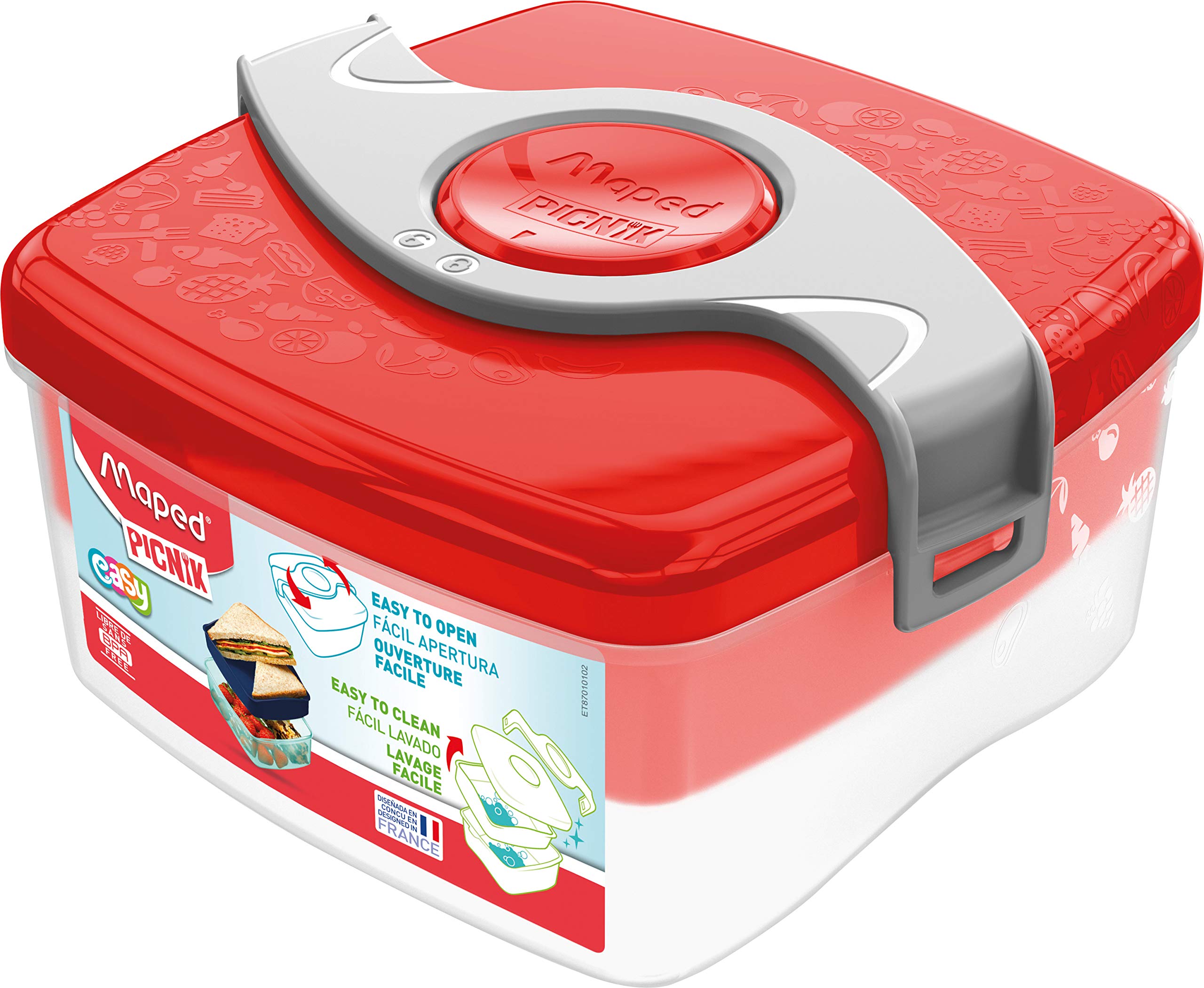 Modern and fun, The Maped Picnik origins concept lunch box is the perfect way to make your children lunch as great as it can be! The patented 'helix' Lock design was specifically developed for small hands and is easy to open or close with just one movement - no complex clips or snaps to worry about. The removable container is perfect for sandwiches, while the compartment below easily store fruits, snacks and more! And because we know that cleanliness is a major concern to a parent, and we've designed every picnic Product with that mind! All interior plastic surfaces are coated with an innovative stain-resistant finish to avoid discoloration from dark foods like tomatoes, grapes and peppers. Rounded, shallow corners make wiping away food or dirt A snap too, and for a deeper clean just place the removable compartment & base into the top rack of the dishwasher!