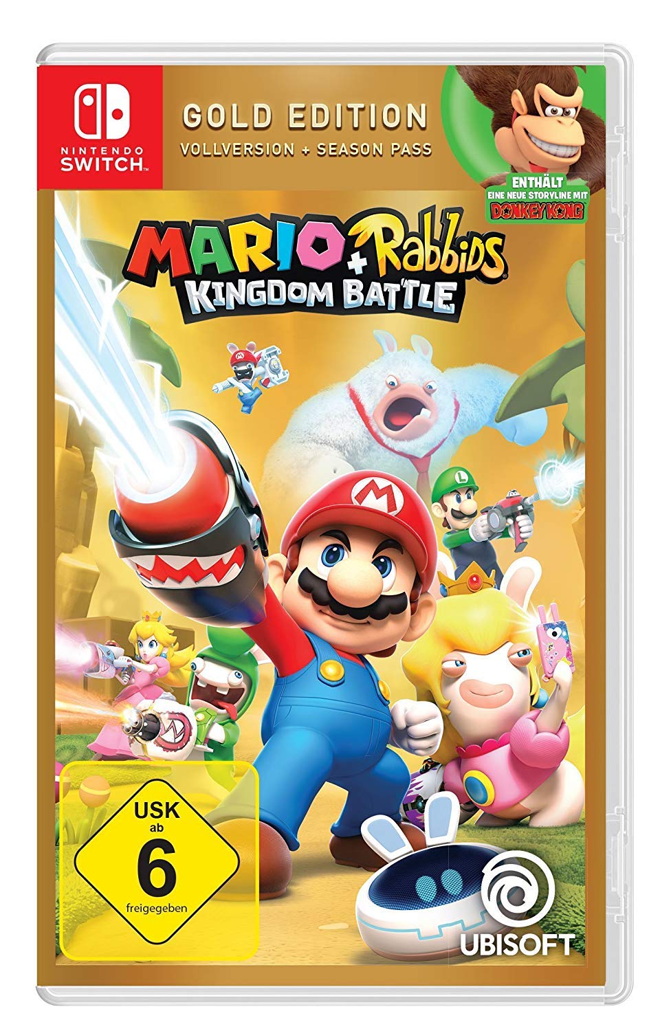 Discover the Mario + Rabbids Kingdom Battle Gold Edition, the ultimate version of the game!Mario + Rabbids Kingdom Battle tells the story of an unexpected gathering between the most famous video game figure, Mario, and the irreverent and messy Rabbids. The mushroom kingdom was torn by a mysterious swirl that teleported the Rabbids into the once peaceful land. To restore order in the kingdom, Mario, Luigi, Princess Peach, Yoshi and the Rabbids unite and embark on a journey through four different worlds.Players can discover four new worlds of the Rabbids completely twisted with a total of eight heroes filled with secrets and many references to classic Mario games. The players expect a variety of opponents in a dynamic round-based battle system, co-op challenges and puzzles. Designed exclusively for the Nintendo Switch system, this fun and modern battle adventure is playable anywhere, anytime, with anyone.Embark on an adventure with them and experience the mushroom kingdom as you've never seen before. A new world upside down by the mischievous Rabbids, full of secrets and allusions to classic Mario games!An epic adventure!Embark on an epic adventure with Mario, Rabbid-Peach and Rabbid-Luigi to save their friends and restore order in the Mushroom Kingdom! Explore a wide world, solve tracked puzzles and defeat unpredictable opponents on the battlefield.Crazy battles!Mario and his friends use never-before-seen weapons to defeat their enemies in hilarious battles. Each character has its own arsenal with which he can face the vast variety of opponents. Control a team of 3 characters and master the most explosive of all challenges!8 epic heroes!It's the dark times when new heroes rise. Discover an epic adventure with 8 heroes and their individual personalities: Mario, Peach, Yoshi, Luigi, Rabbid-Luigi, Rabbid-Peach, Rabbid-Yoshi and Rabbid-Mario.Gold edition contents:The game "Mario + Rabbids Kingdom Battle with a special gold key art.Digital E content: the season pass.• The Pixel package offers you 8 weapons in 8-bit optics.• Steampunk package unlocks 8 steampunk style weapons• The Ultra Challenge package contains 8 ultra-heavy challenges in the secret chapter of any world. In addition, there is a new Koop campaign including 5 co-op cards with chain dogs, tornados, buus and volcanic rock.• Donkey Kong DLC