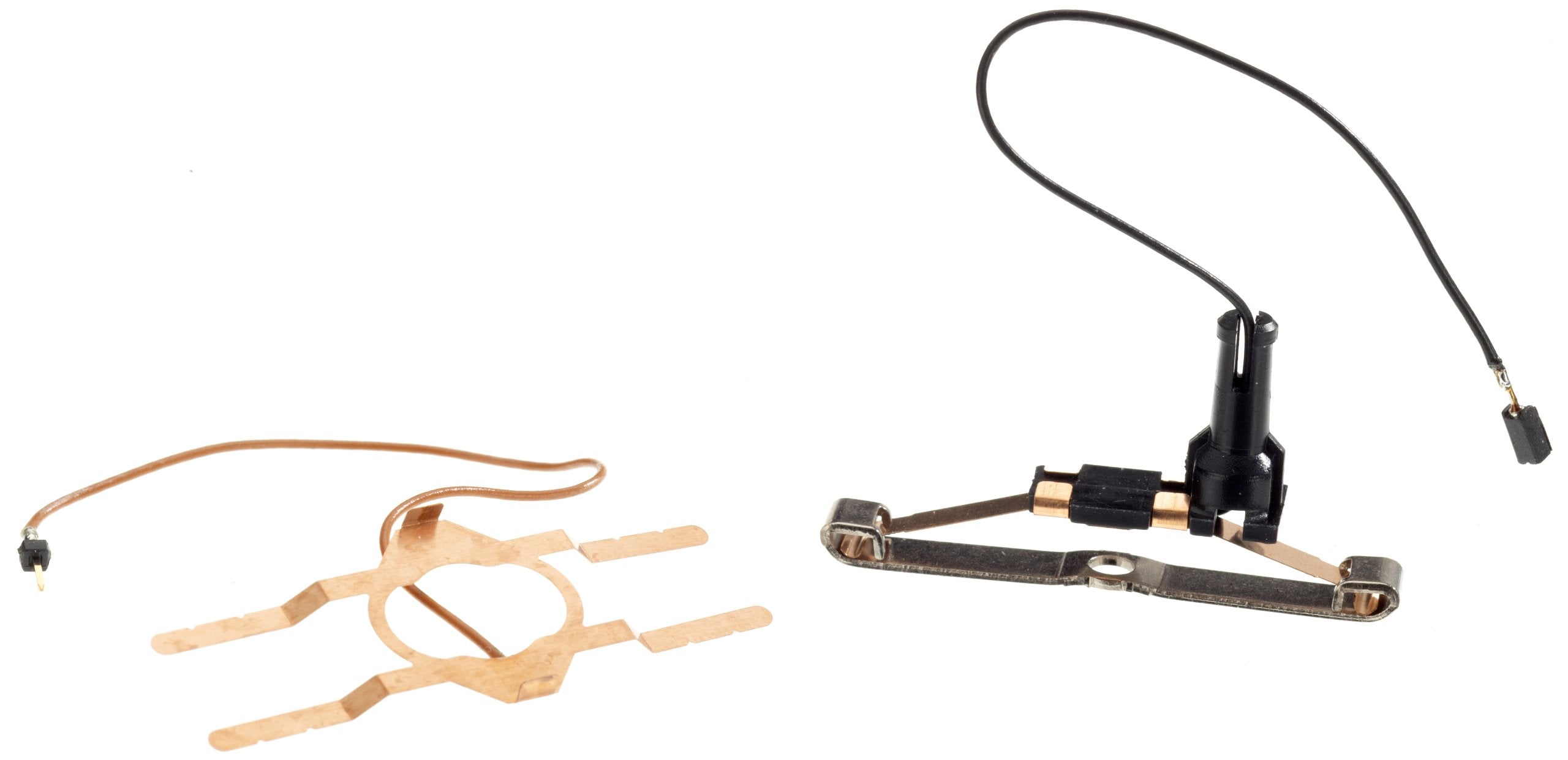 Pickup Shoe / Ground Spring Power Feed Set. Gauge: H0. Era: I-V. For the 73400 interior lighting kit. Includes an asymmetrical pickup shoe and a ground spring. The combination of 2 each 73400 + 1 each 73406 is the standard lighting for the new UIC-x cars with a length over the buffers of 28.2 cm / 11-1/8".