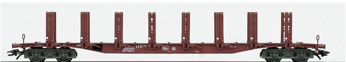 Stake Car. Gauge: H0. Era: IV. Prototype: German Federal Railroad (DB) type Snps 719. Model: The car has finely detailed, fixed double stakes with tiedown levers. The load surface is picked out in a different color. Length over the buffers 23.9 cm / 9-3/8". DC wheel set 4 x 700580.