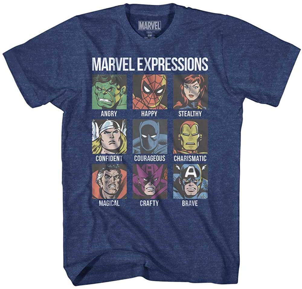 This great shirt shows real expressions and moods from some of your favorite movie and comic heroes!