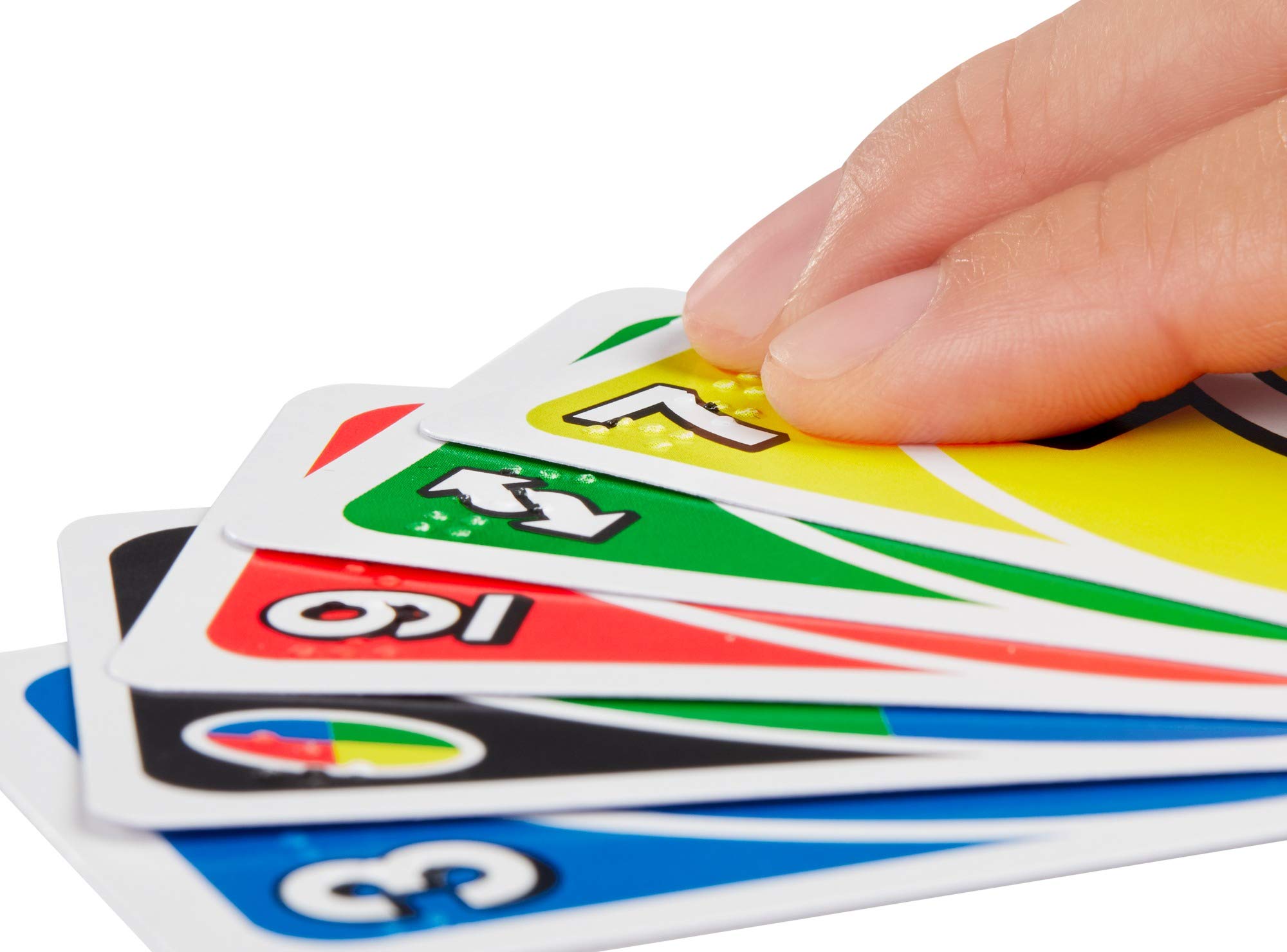 Classic family card game UNO is now available with braille on every card! UNO Braille was developed in partnership with the National Federation of the Blind to make it easy for blind and low-vision players to join in the fun. Like in classic UNO, match cards by color or number in a race to deplete your hand and play action cards like Skip, Reverse and Wild Draw Four to throw off the competition. Score points by being the first to get rid of all the cards in your hand, and when you're down to one card, don't forget to yell, 'UNO!' Braille is featured on packaging as well as on all 112 cards in the deck. Check to access audible and printable braille instructions! Colors and decorations may vary..
