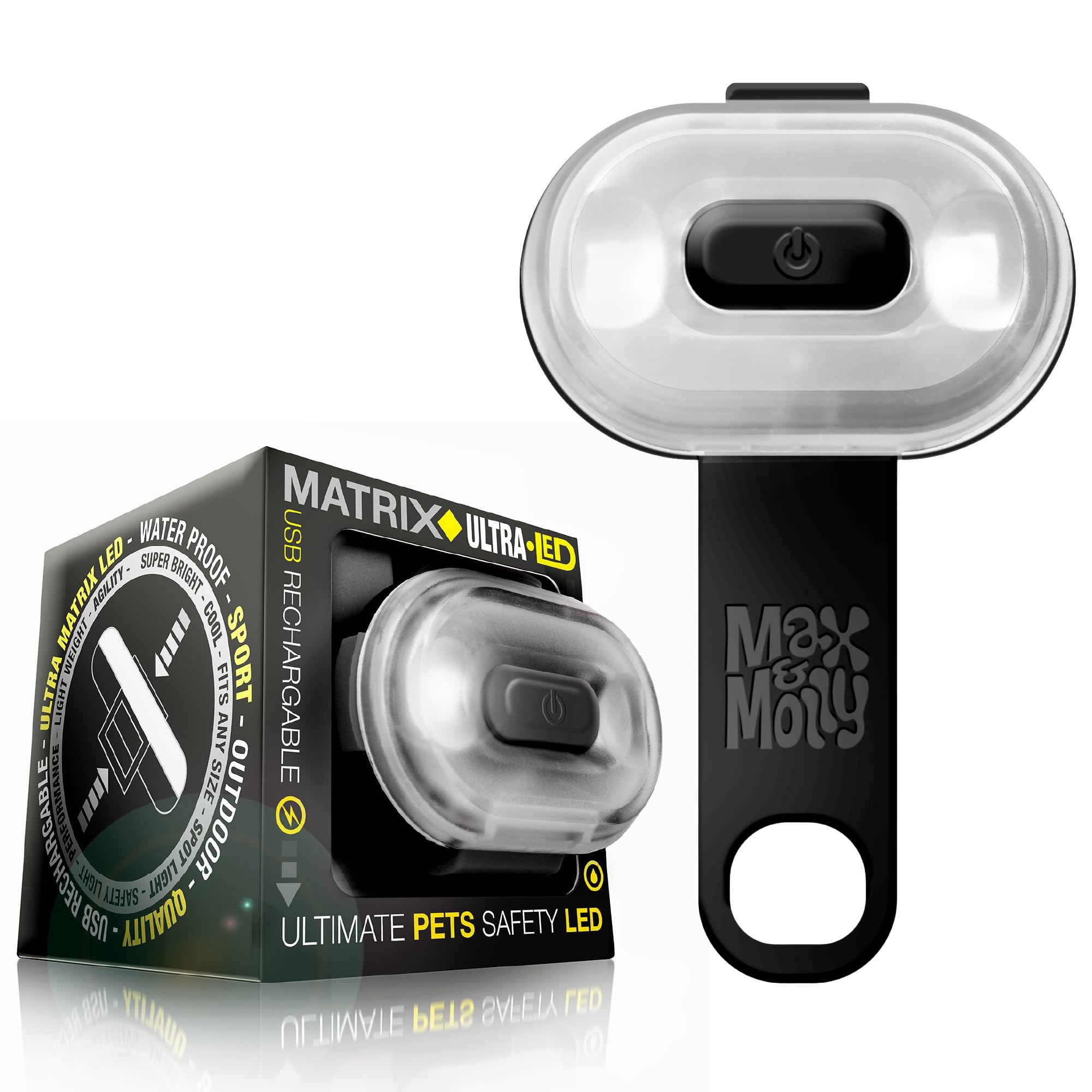 Product DescriptionThe Max & Molly Ultra Matrix LED Light is a USB rechargeable and waterproof light that fits on any size dog collar. With three light function settings and using the brightest LED in its class, the Max & Molly light will keep your best friend safe and easily spotted.Box ContainsMax & Molly, The Ultimate Quality Pets Ultra Safety Led, The Brightest In Its Class, Waterproof, Black Including Usb charger Including USB Charging Cable