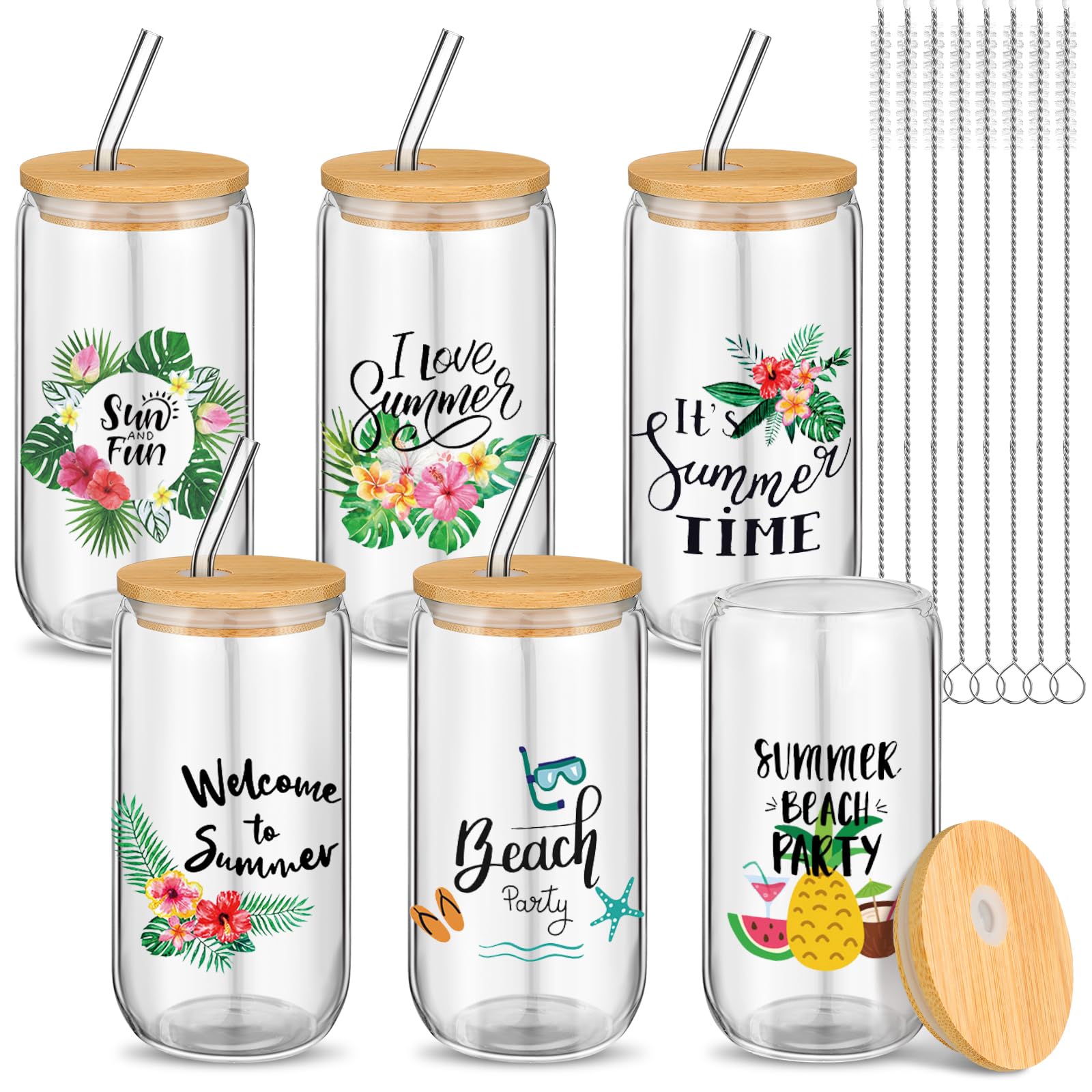 Maxcheck 6 Set Christian Glass Cups with Lids and Straws Brushes 16 oz Iced Coffee Summer Drink Cups Sunflower Tumbler Employee Appreciation Gifts Beer Glass for Friends Coworkers Gifts(Summer)