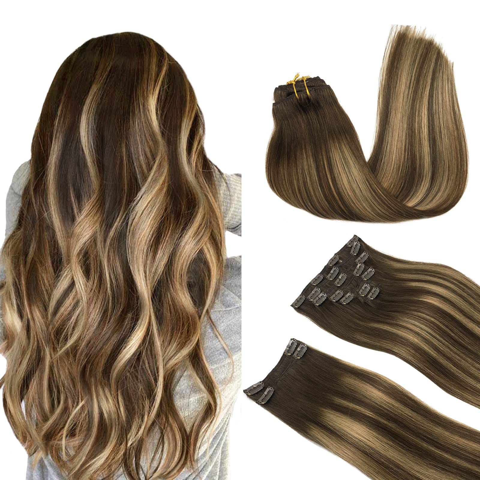 MAXITA Human Hair Extensions Clip in, Balayage Chocolate Brown to Caramel Blonde 9pcs 150g 20 Inch, Remy Thick Clip in Hair Extensions Straight Long Real Human Hair Extensions Clip ins for Women