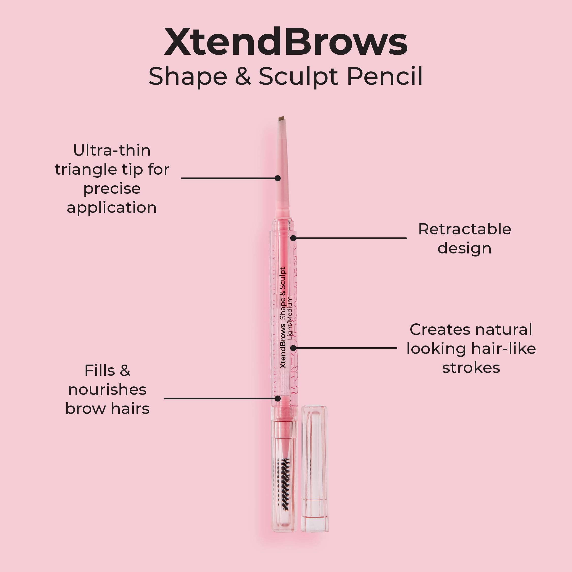 The MCoBeauty XTENDBROWS SHAPE & SCULPT PENCIL is a long-wearing and pigmented formula that fills in sparse brows with natural hair-like strokes. The nourishing formula is infused with Castor Oil and B5 to help condition and support the growth of brow hairs, while the precise triangle tip is perfect for creating natural hairlike strokes. This product naturally fills in gaps without looking heavy and artificial, while the spoolie brush helps sculpt brows to perfection.