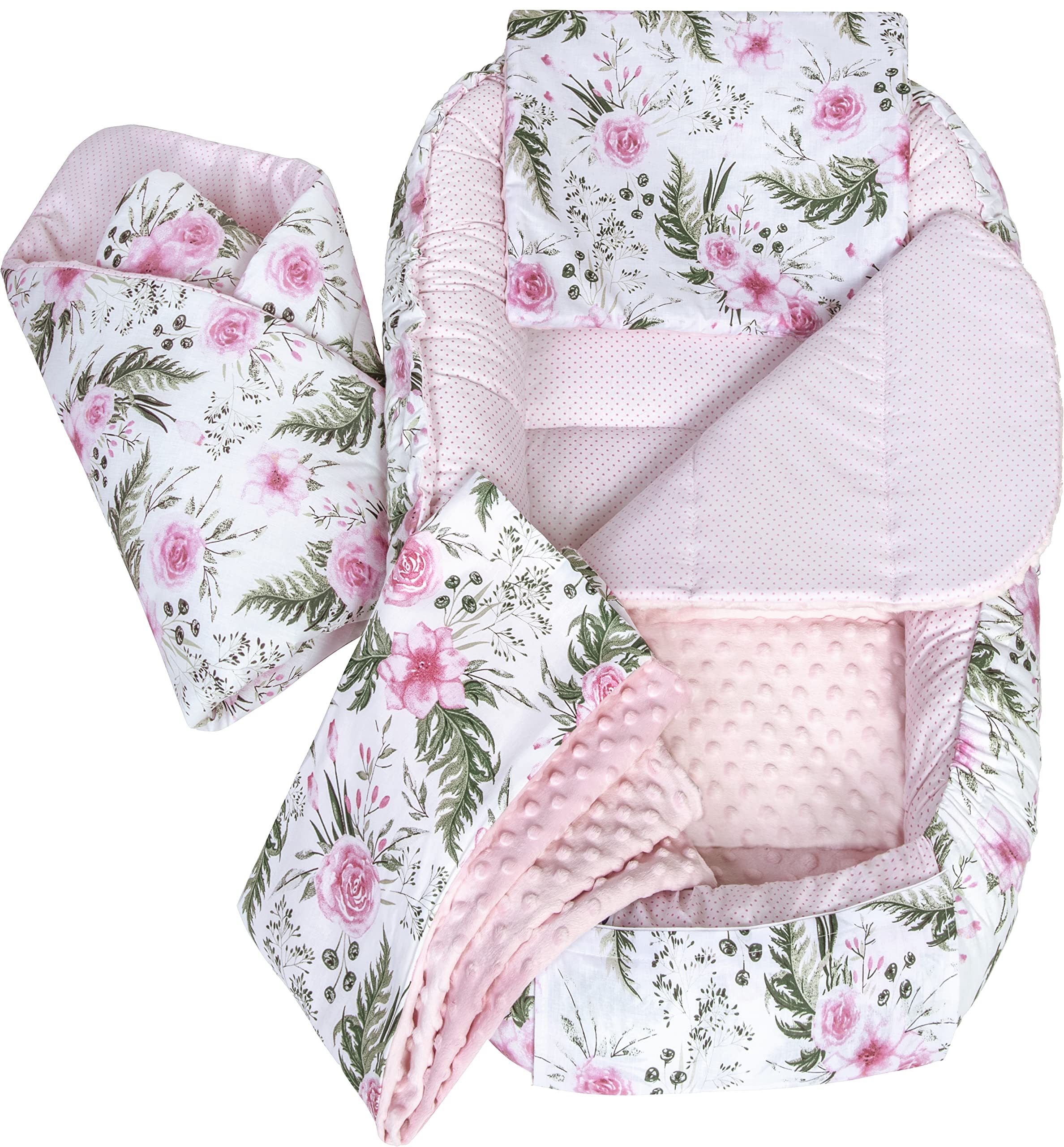Set Includes:1. Double-sided cocoon made from 100% cotton.Outer dimensions: 90 cm x 50 cm x 13 cm.Inner dimensions: 70 cm x 30 cm.2. Removable insert size: 90cm x 50cm x 3cm3. Flat cushion size: 30cm x 35cm x 2cm4. Crawling blanket size: size 55cm x 75cm x 1cm5. Cushion 100% cotton 75 x 75 cm.Insert, flat cushion, crawling blanket can be used on both sides (one side of the cotton insert, the other side is made of fine minky fabric) Materials used: - 100% cotton with a weight of 125 g/m²- 100% polyester - Minky- Weight 380 g/m²- 100% polyester - Anti-allergic silicone ball - fills the edges of the cocoon.- 100% polyester - cotton wool 300 g/m² - filling of the cocoon base - flat (both in the cocoon and in insert).All materials used are certified according to Standard 100 by Oeko-Tex. Instructions for use: wash at 30 °C, fine program, max. 800 rotations spin, iron the cotton fabric at a temperature of up to 110 °C. Use gentle detergents, do not use bleach, do not tumble dry