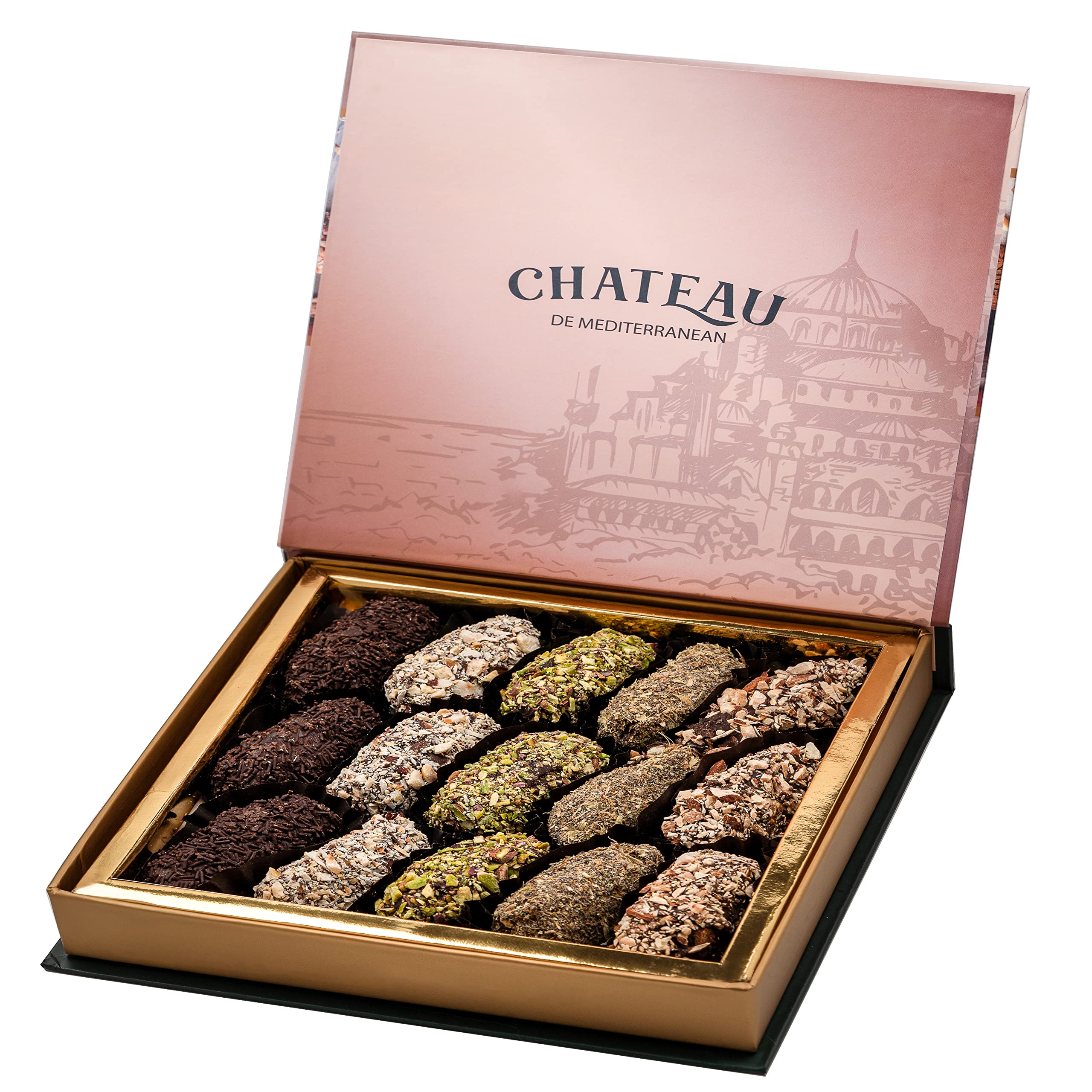 Medjool Dates filled with Almonds, coated in Dark Chocolate, rolled in Vermicelli Chocolate, Pistachio, Cashew and Walnuts.