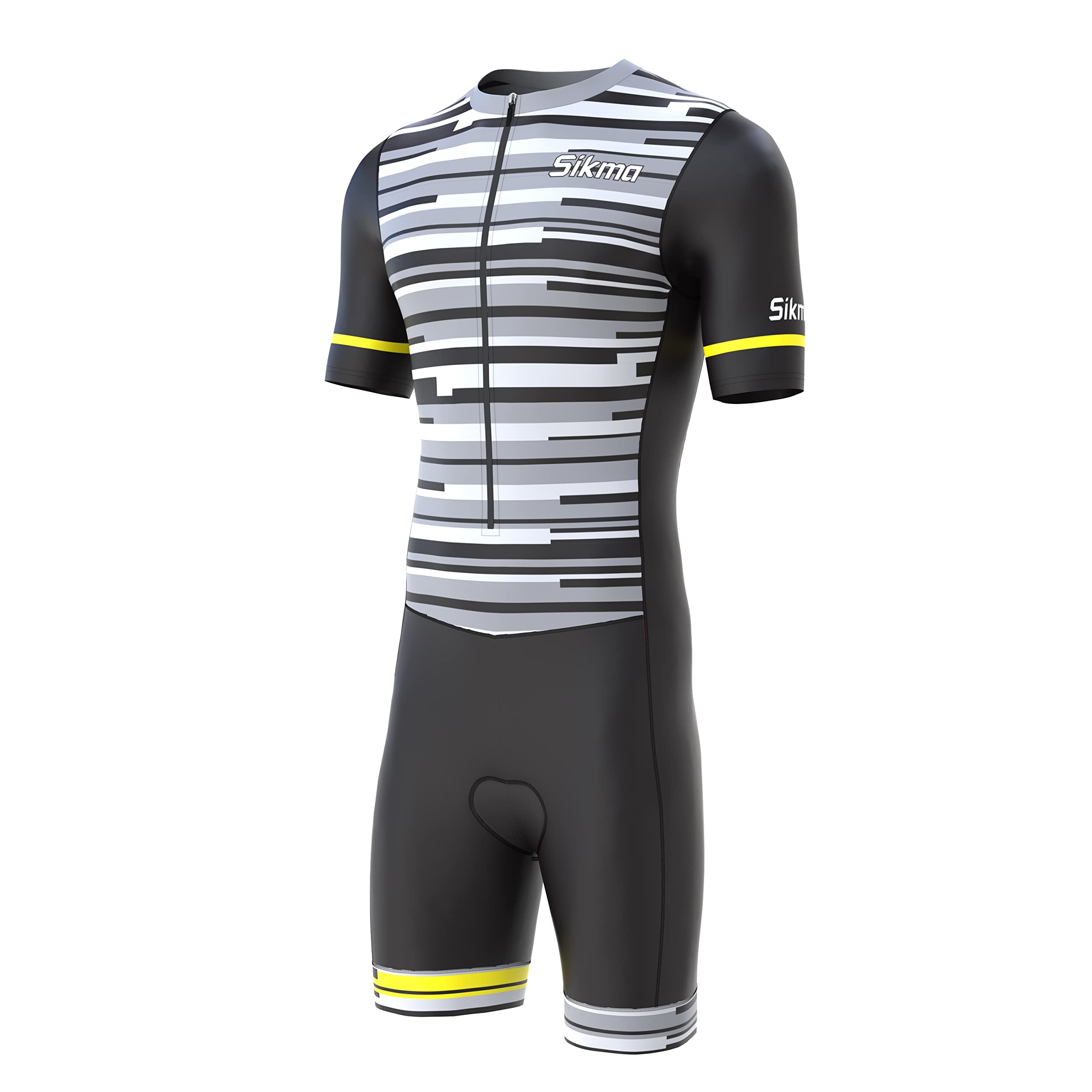 Sikma Mens Cycling Skinsuit Brand New specially designed for long rides and more comfortability. New Sublimated design to ensure tight race fit , High Quality comfortable Gel Padding. One Piece suit has half zip to keep your body ventilated and prevent irritation. Features: Brand New Skinsuit with SIKMA Reflective Logo PrintedEasy Wear and Take off/ Excellent Fit around BodyProfessionally Made with High Performance, Light weight Lycra FabricMoisture wicking, Quick Dry and BreathableSpecially made edges to prevent the skinsuit riding upHigh Quality Anti Bacterial Padding