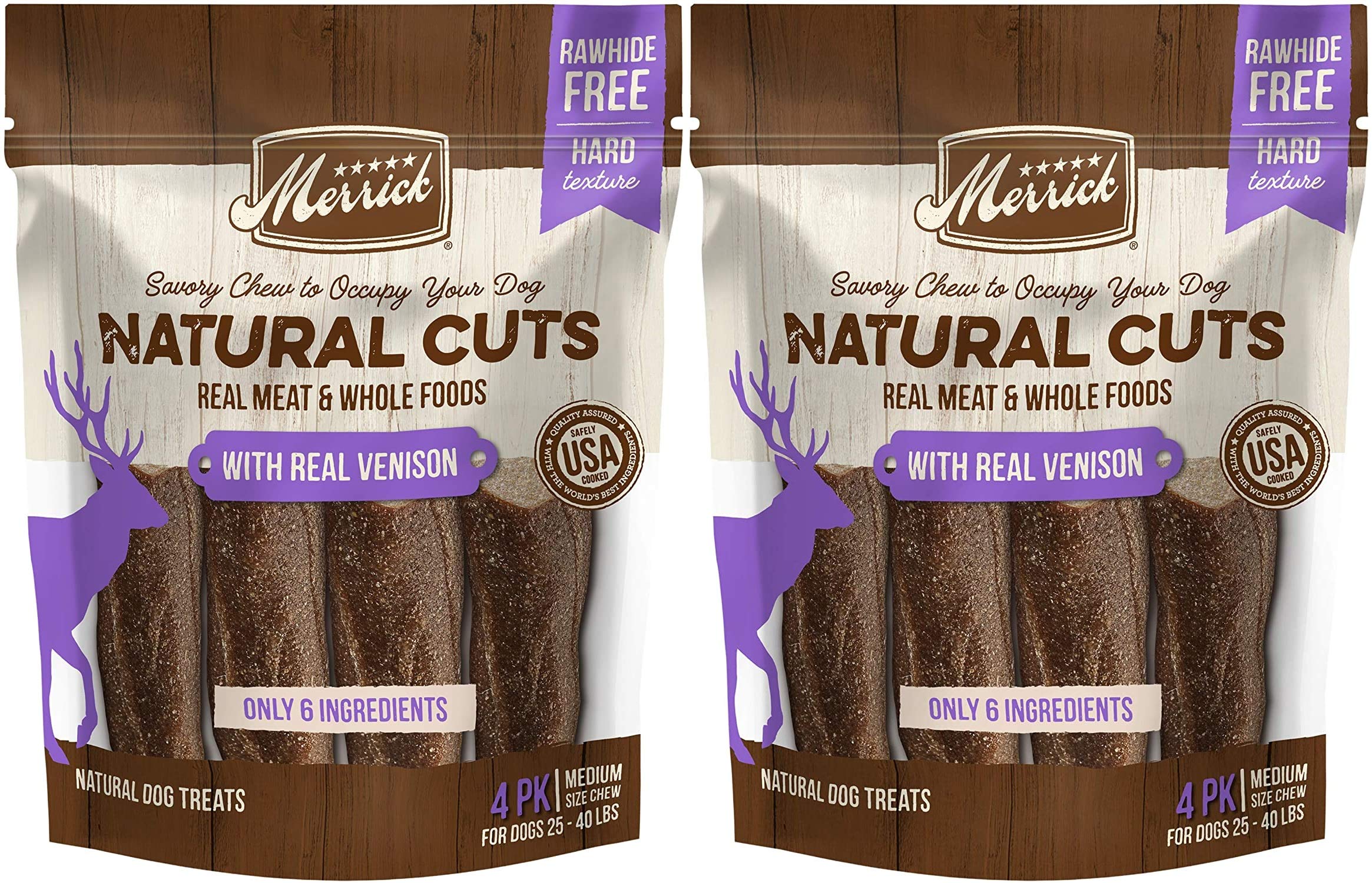 Merrick Natural Cuts Rawhide Free, Small Dog Chews with Real Venison are savory real meat dog chews designed to keep your small-sized dog occupied. These rawhide free dog chews are made with natural ingredients, real meat and whole foods. These Natural Cuts treats have an outside hard texture, perfect for pups that are tough chewers, and are crafted with only six ingredients for limited ingredient dog treats that make treat time extra special. Merrick Natural Cuts small breed dog treats are sized for small dogs weighing 25 lbs or less and are designed to occupy your dog with no staining, splintering or plastic. Staying true to the name, Natural Cuts are natural dog treats, crafted as rawhide free dog chew sticks and do not contain artificial flavors, colors or preservatives. Merrick dog treats are crafted in our Hereford, TX kitchen and cooked in the USA.