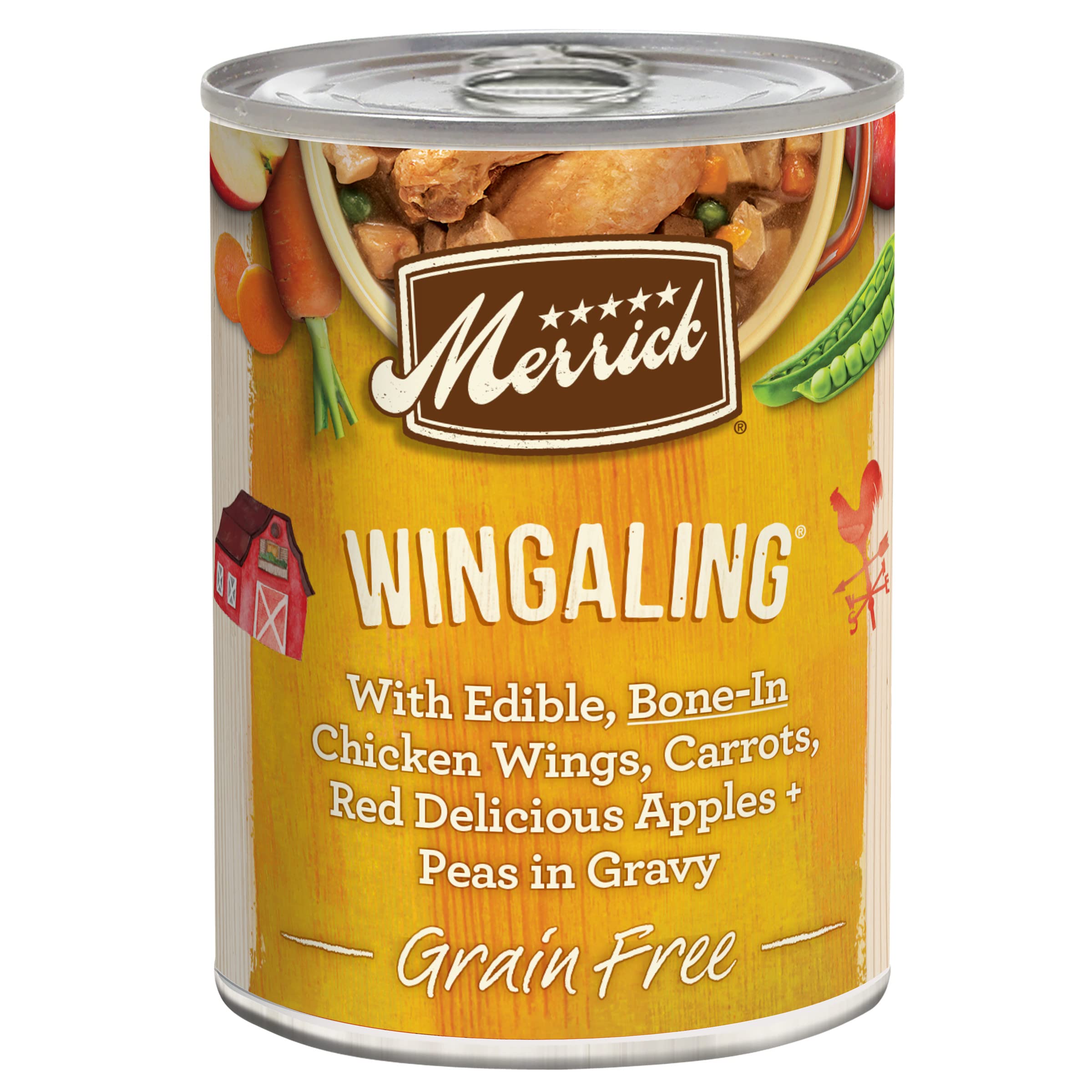 Merrick Grain Free Wet Dog Food Wingaling's first ingredient is always real chicken. Our slow cooked, whole chicken thighs and wings offer marinated tender chicken cooked on a softened bone. This special cooking process makes the bone soft and safe for your dog to enjoy. Other natural ingredients, including real peas and carrots, lend wholesome goodness and variety to your dog's menu. A savory dog food gravy made with chicken broth for dogs adds even more flavor and moisture to daily meals. To meet your dietary preferences, this grain free wet food for dogs with vegetables contains no artificial colors, flavors, preservatives or by-products. Use this Merrick moist dog food recipe as a topper for your dog's dry kibble, or serve it as a nutritious standalone meal. A convenient pull-tab can makes preparing your dog's meal quick and easy. Like all Merrick recipes, Wingaling was crafted in our Hereford, TX kitchen and cooked in the USA.