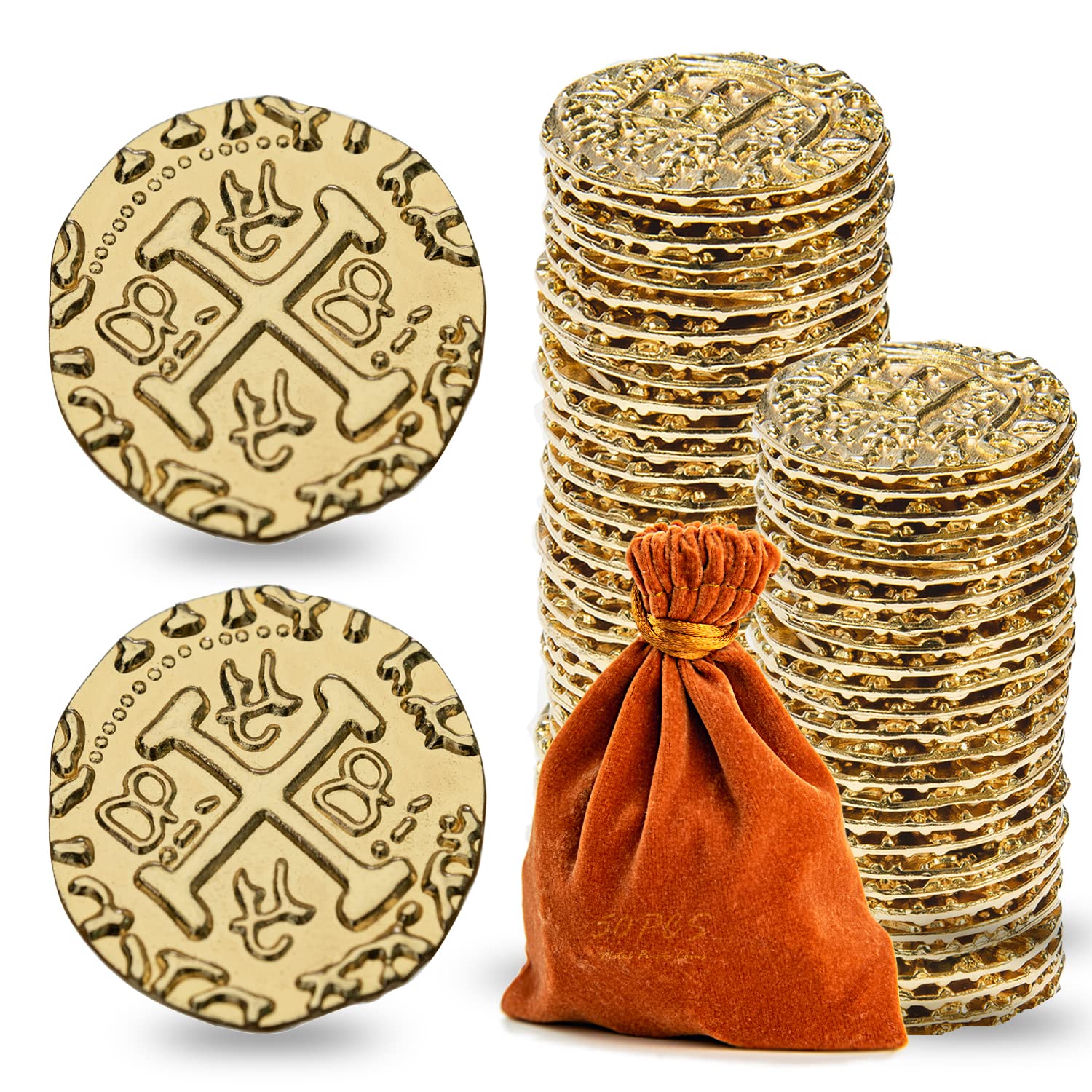 Metal Pirate Coins, Prefdo 50PCS X Large Gold Treasure Coin Set Spanish Doubloon Replicas Fantasy Metal Coins Pirate Gold Coins Tokens for Board Games Pirate Party Cosplay