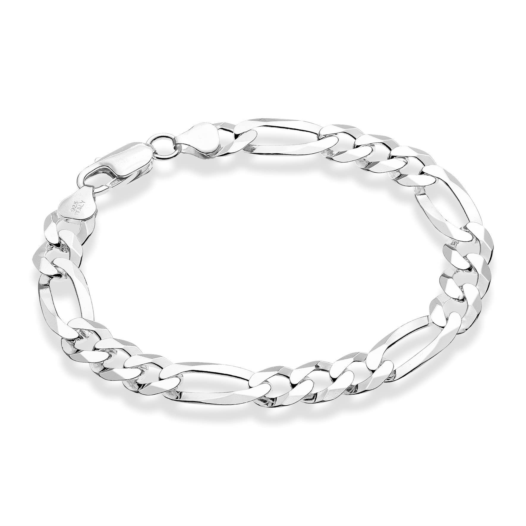 Miabella brings you the finest in modern and classic design. Make a cool statement with this solid and bold 925 sterling silver 9mm wide Figaro bracelet. Like no other Figaro chain in the market, our special diamond-cut offers a much more reflective look than a standard Figaro chain. Made in Italy