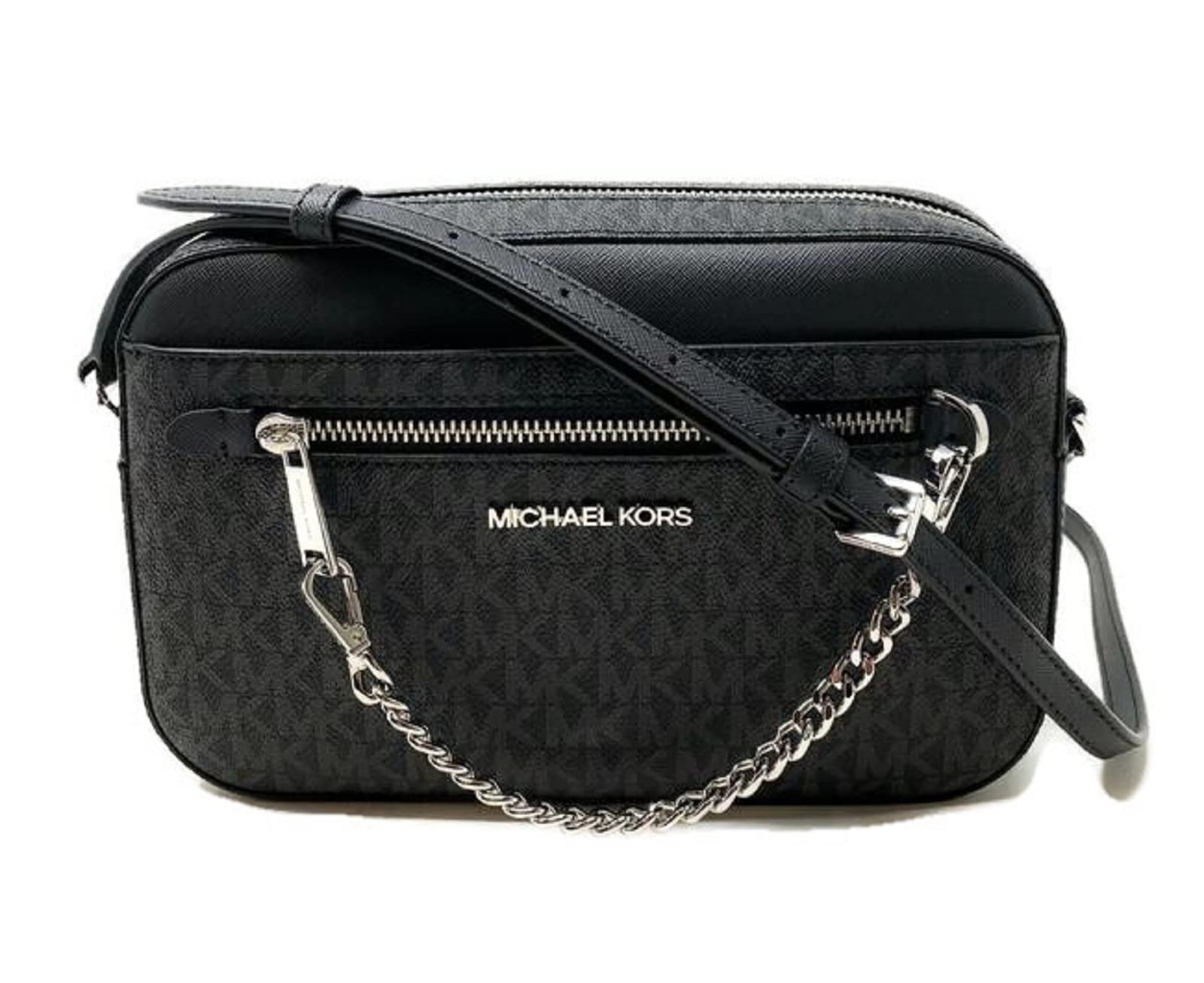 Michael Kors Jet Set Large Leather Crossbody Bag (Black Signature/Silver HW) 89.4% coated canvas/9.6% polyester/1% polyurethane, Silver hardware, Zip fastening Interior details: back and front slip pockets, Lining: 100% polyester Exterior details: detachable crossbody strap, back slip pocket, front slip, and zip pockets Approximate Measurements: 9.5” W X 6.5” H X 2” D, Dust bag not included.