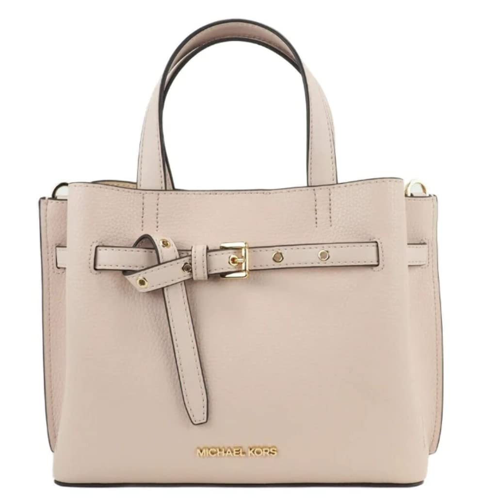 Wherever, whenever-our Emilia satchel works hard and reads chic. Elegantly streamlined and crafted from pebbled leather, this everyday handbag is designed in a sizeable silhouette punctuated by a belted silhouette and gold-tone hardware. Detach the crossbody strap to carry yours by the top handles.
