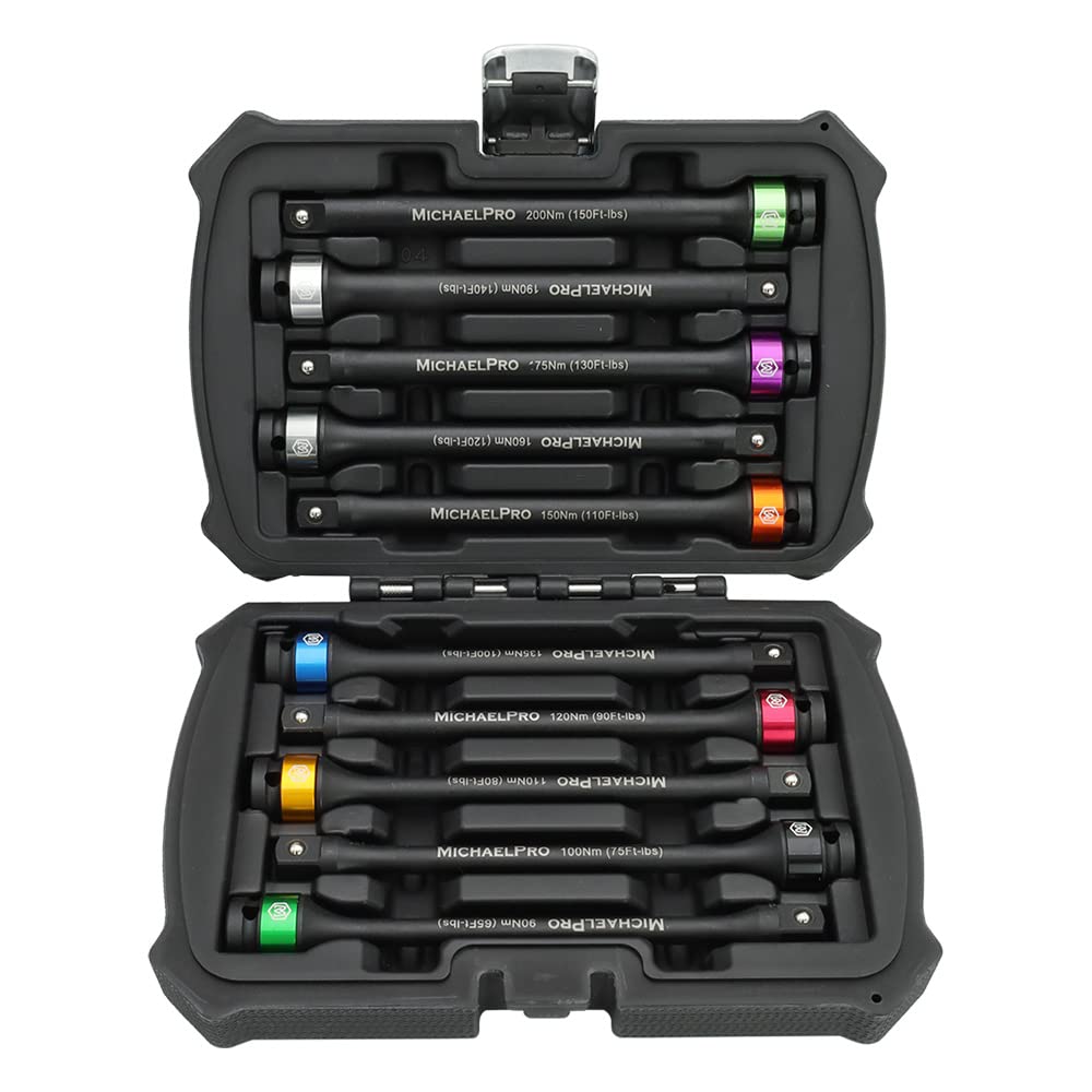 MichaelPro 10-Piece 1/2-Inch Drive Torque Limiting Extension Bar, 65 to 150 Ft-Lbs (90 to 200 Nm), 8-Inch Length, Heavy Duty Torque Applications | MP001208 TOUGH CONSTRUCTION MichaelProâs Torque Limiters are constructed from tough impact grade Chrome Molybdenum Steel (CR-MO) for heavy duty use with impact drivers. They are coated with Manganese Phosphate for enhanced strength and resistance to rust and corrosion. Thus, extra durable and extended lifespan. WHATâS INSIDE This set includes ten 1/2-inch drive impact torque limiting extension bars ranging from 65 foot-pounds to 150 foot-pounds (95 - 200 Nm) of torque. SAVES LUG NUTS 1/2â Drive size is compatible with impact drivers to limit torque consistently and accurately to prevent lug nuts and fasteners from over-torqueing. These torque limiters loosen bolts and nuts quickly even at awkward angles and in hard to reach areas. They prevent over-tightening which can cause premature failure of wheels, wheel studs, and rotors. PICK AND GO Each torque limiting bar is color-coded with visible torque limit specifications for easy identification and retrieving. These torque limiters come with a blow-molded case for convenient storage and transport. RELIABLE & TRUSTABLE Engineered and tested in Taiwan, where its being widely recognized for its dedication in producing premium quality tools, this tool is definitely one of the essentials in your garage, workshops or home. Our customers trust our tools to be of quality ones. If you experience any issues, simply contact us for assistance or give us your feedback!