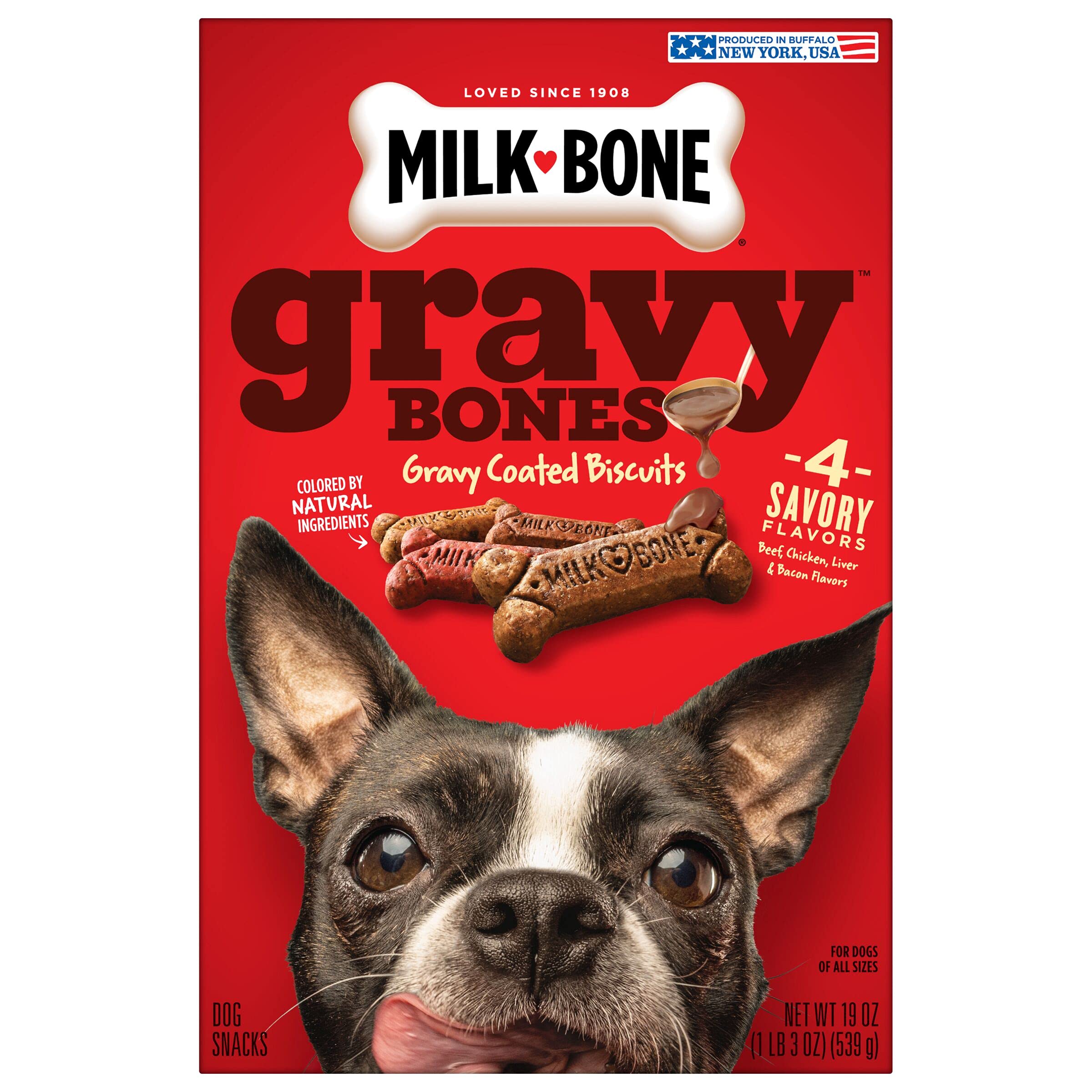 Milk-Bone GravyBones dog biscuits feature the same vitamin-fortified goodness of Milk-Bone Original dog snacks in 4 delicious, gravy-basted varieties your dog will love: beef, chicken, bacon and liver flavors. These tasty dog treats are prepared with care in Buffalo, New York, USA, using only natural ingredients as sources of color. Better yet, the crunchy texture of Milk-Bone dog biscuits helps freshen dogs′ breath and reduce tartar build-up. So you can not only feel good about the wholesome goodness you′re giving your doggo; you can also fully enjoy all the grateful, sloppy kisses that are sure to come your way. Win-win.