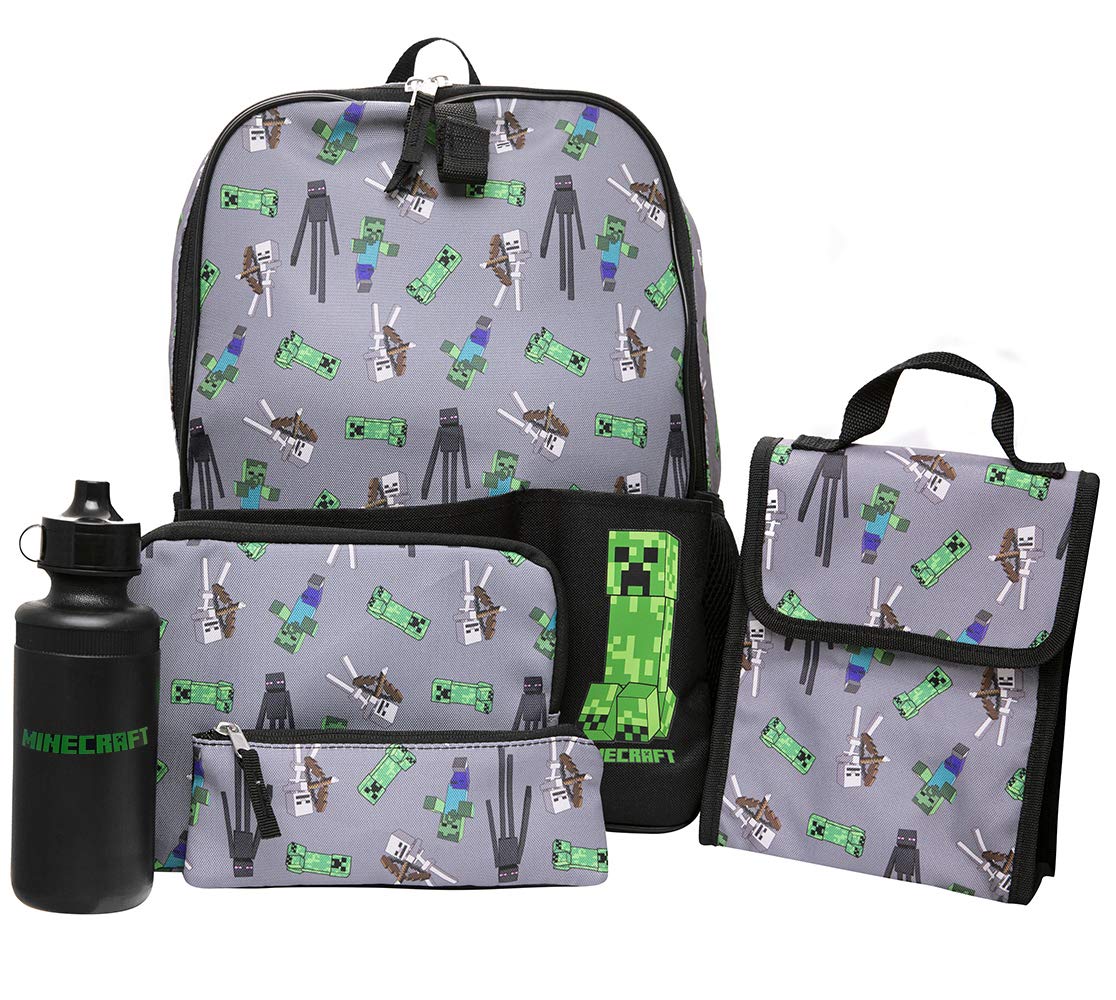 Minecraft Backpack 5 Piece Back to School Set Approx Dimensions: Bag = 36 x 26 x 10 cm / Lunchbox = 21 x 20 x 9.5 cm / Pencil Case = 20 x 8 cm The bag includes a zipped main compartment, front pocket, and an awesome Creeper Print with Big Creeper Logo on Front of Rucksack Comes with a Minecraft lunch bag which has velcro closure, a zipped pencil case, a Large Utility Case for Tablet etc and a water bottle Officially Licensed Minecraft Merchandise