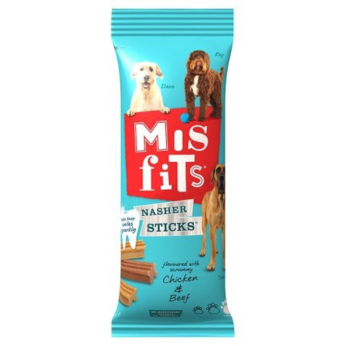 DescriptionProduct DescriptionMisfits Nasher Sticks Large Dog Treat with Chicken and Beef is featuring a scrummy combination of seriously tasty chicken and beef in a nice nibbly texture. It contain no artificial colours or flavours. It is a mixed bag of fishy and meaty shapes and flavours. Dogs will love to chew away at Nasher Sticks. They're low in fat and they'll help keep your dog's teeth nice and clean by reducing plaque and tartar.IngredientsCereals, Derivatives of Vegetable Origin, Minerals, Vegetable Protein Extracts, Meat and Animals Derivatives (including 1% Beef, 1% Chicken), Oils and FatsDirectionsStore in a cool and dry place.Safety WarningTo avoid suffocation, keep bags away from babies, young children and pets.Manufacturer Contact InformationGB - Mars Petcare UK, PO Box 9346, Melton Mowbray, LE13 9DR. IRL - Mars Ireland, PO Box 3856, Dublin 4.