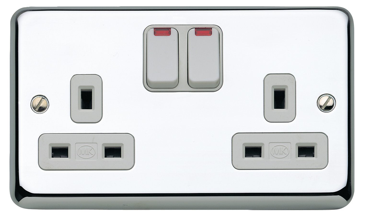 Product DescriptionDisplaying a superior mirror-like finish, MK’s Chroma Plus range brings a lustrous and iridescent quality to modern interiors. As trends in contemporary decor increasingly include the use of chrome accessories, Chroma Plus provides provides interior designers with a stylish and practical wiring device solution. High quality, lustrous finish with modern curved design providing a clean and practical range of products that complement the decor of the finest modern interiors. Comprehensive range of sockets, switches and ancillary products. Whatever the application, the Chroma Plus range has a wiring device to suit In addition to impressive looks, with Chroma Plus comes unrivalled safety. Utilising MK’s 3-pin operated safety shutter, that prevents misuse and unsafe access to live circuitry, Chroma Plus offers the user the peace of mind and comfort that they have the safest range of wiring devices available installed in their surroundings. Box ContainsMK Chroma Plus K2448PCR 13A 2 Gang Double Pole Switch Socket NeonFixing ScrewsInstallation Manual