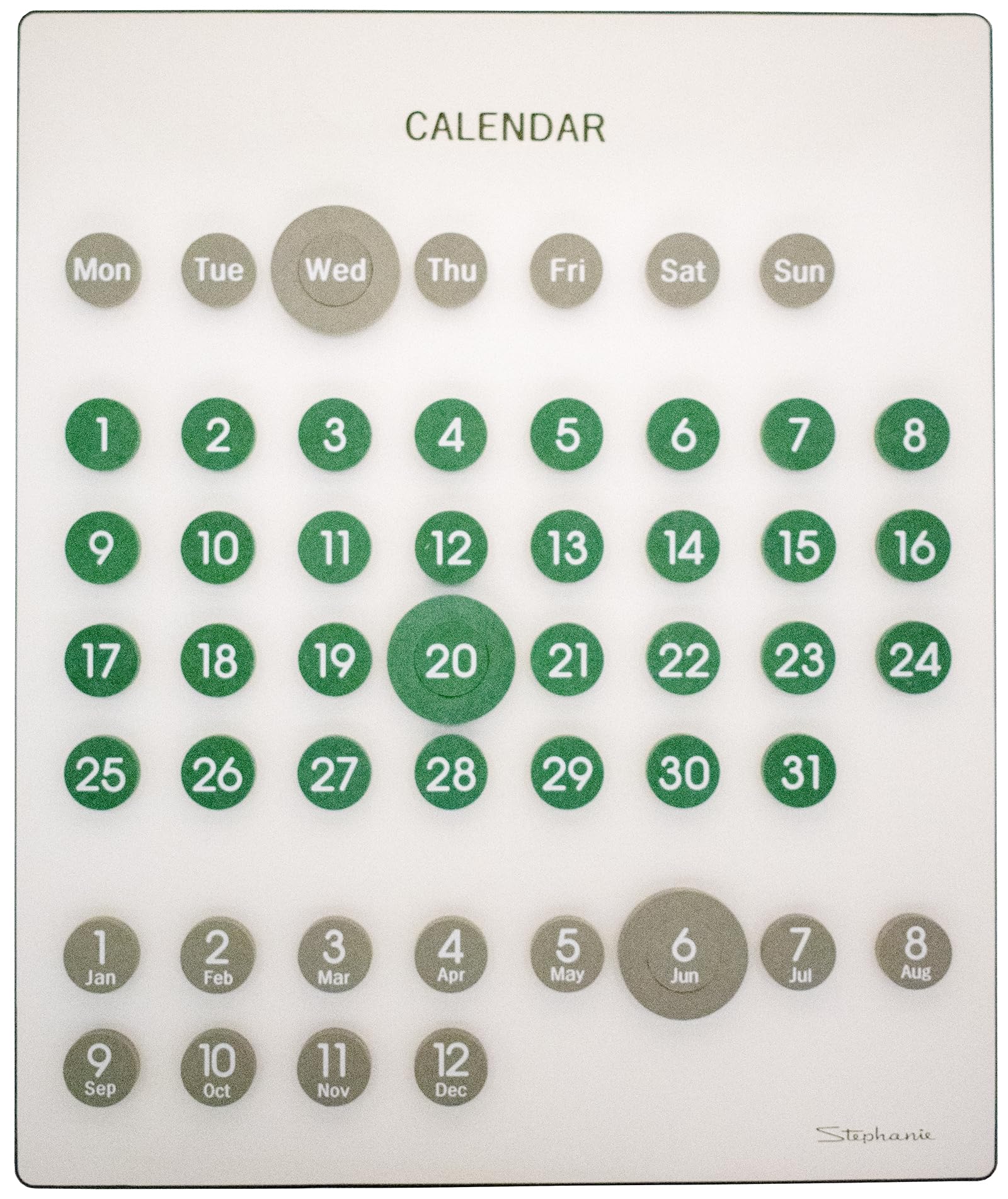 The calendar features dozens of round knobs, each separated by Day of the Week, Date, and Month. Use the included rings (there are 6 in each package) to mark the current date.