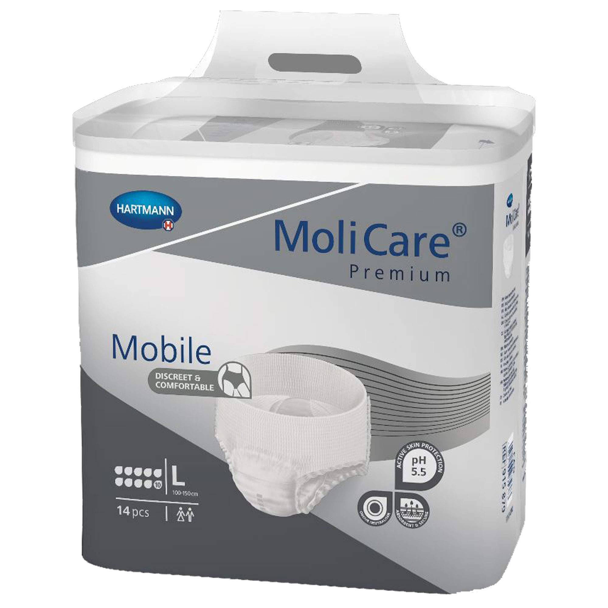 DescriptionMoliCare Premium Mobile 10 droplets - reliable protection against severe urinary incontinence Innovative properties combined with the highest quality makes MoliCare Premium Mobile the first choice for light to heavy incontinence. MoliCare Premium Mobile 10 droplets is extremely absorbent, disposable underwear designed for the highest protection requirements for the most severe urinary incontinence. It is worn just like conventional underwear and is particularly suitable for wearing at night. The inside leg openings are liquid-repellent and, together with the three-layer absorbent core, ensure maximum leakage protection and additional security. Feel good again in your own skin and live life to the full With this disposable, unisex underwear you gain additional peace-of-mind and self-confidence, and can feel good about yourself again. Odours are reliably locked away and neutralised. The wetness indicator on the back shows when the product needs to be changed. Experience normality in your everyday life and enjoy all-round protection, discreetness and excellent comfort All the materials used are dermatologically tested and reduce the likeliness of allergic reactions. They are easy to use making them ideal for both extremely active people and dementia patients, who tend to be restless. Advantages of MoliCare Premium Mobile Discreet and unobtrusive Breathable, anti-bacterial materials that are pH-neutral to the skin Odours are reliably neutralised Suitable for women and men Wetness indicator Dermatologically tested Trust in HARTMANN’s extensive expertise. Do whatever you want again and whatever makes you happy - for an active life with a high degree of comfort!