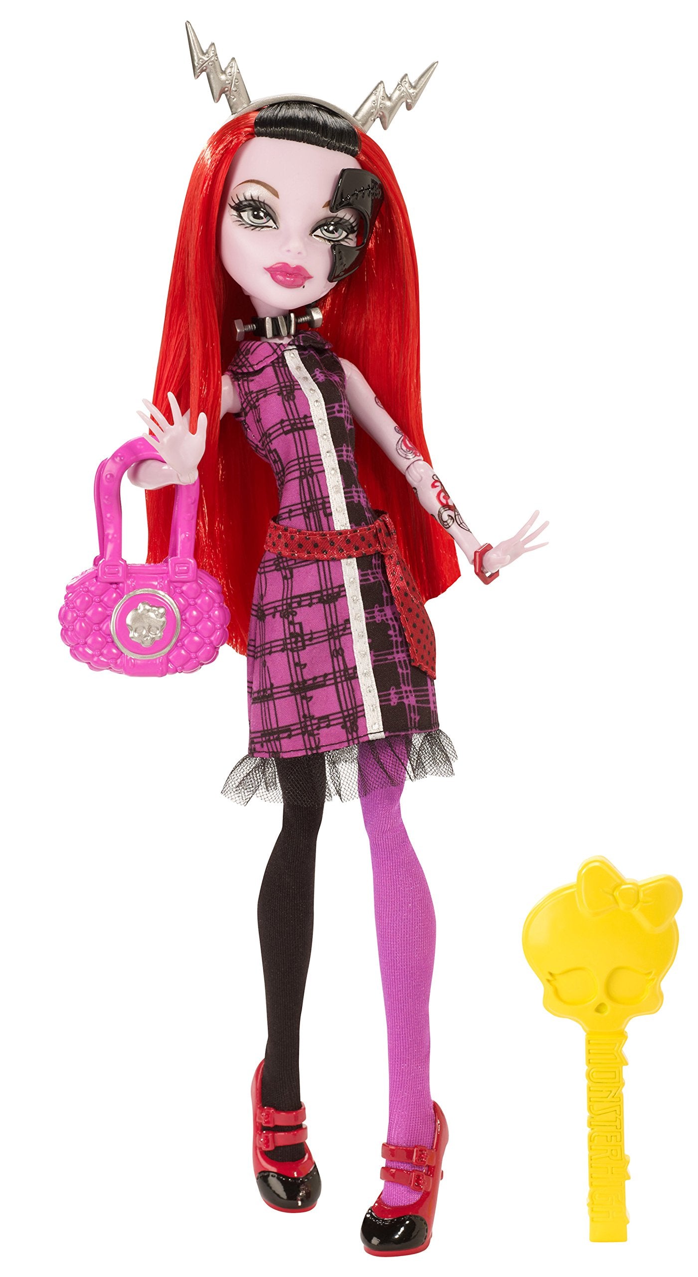 Fusion is all the rage, and the ghouls of Monster High are clawesomely on trend! Taking the lead from their beast ghoulfriends, these Monster High dolls have unique looks and fierce fashions inspired by their ghoulfriends! Operetta is a showstopper inspired by Frankie Stein doll’s killer look. Striking Frankenstein fusion features on this Daughter of the Phantom of the Opera include a lightning bolt headband, nuts-and-bolt necklace and riveting purse with silvery Skullette decal. Her to-die-for pink and black tank dress has a music-inspired print, cool collar and ruffled tulle hem. Block tights, rocking heels, a bangle and tie belt are electric accessories! Operetta doll also comes with a Skullette-shaped brush and doll stand. Collect her fellow fusion ghoulmates (each sold separately) to expand the fun to monster proportions! *Name subject to change.