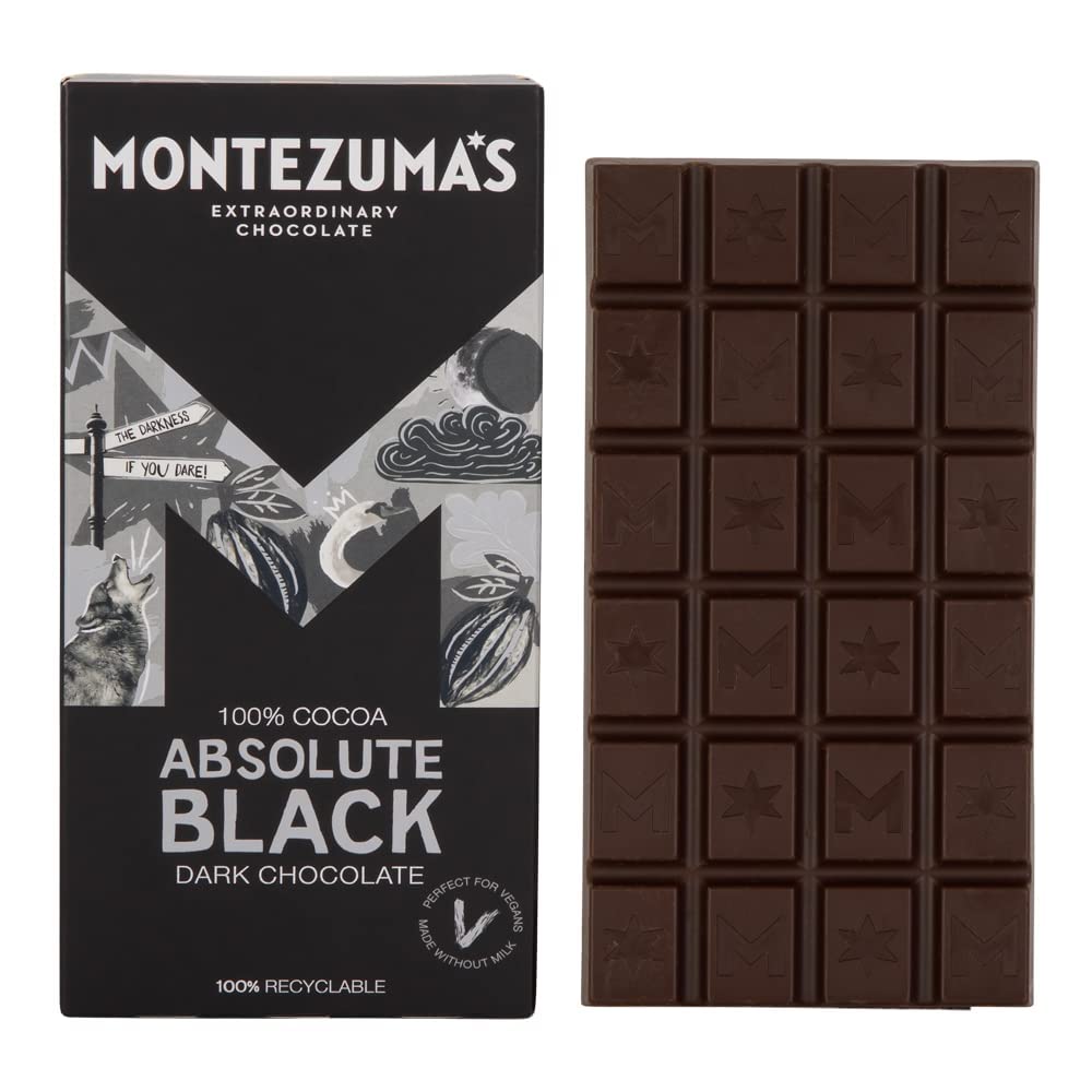 Montezuma's, Absolute Black 100% Cocoa Dark Chocolate, Gluten-free and Vegan 90g Bar. For that dramatic cocoa hit. Don't say we didn't warn you!Here at Montezuma's we have proudly made chocolate in the UK for the past 20 years.HAPPY PLANET HAPPY PEOPLE Since our foundation in 2000, we’ve worked to a set of principles we call ‘Trading Fairly’. These guide everything we do, from sourcing our cocoa, to developing our products, and working with our partners.We're passionate about finding ways to reduce our impact on our beautiful planet.We’re proud that all our packaging is 100% recyclable, bio-degradable or compostable at home.