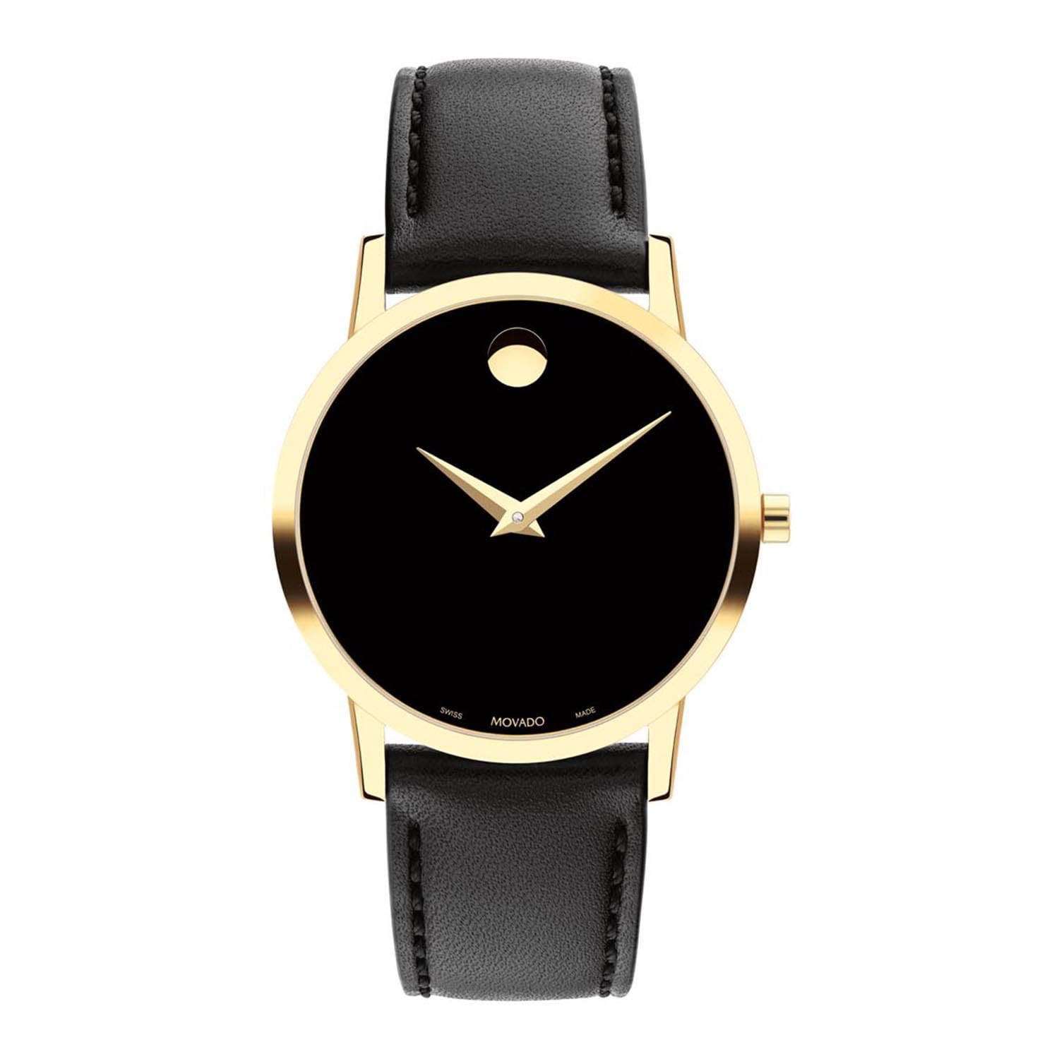 Movado womens watch. Gold stainless steel case Black dial. Swiss Quartz movement. Buckle closure. Water resistance of 30 meters.