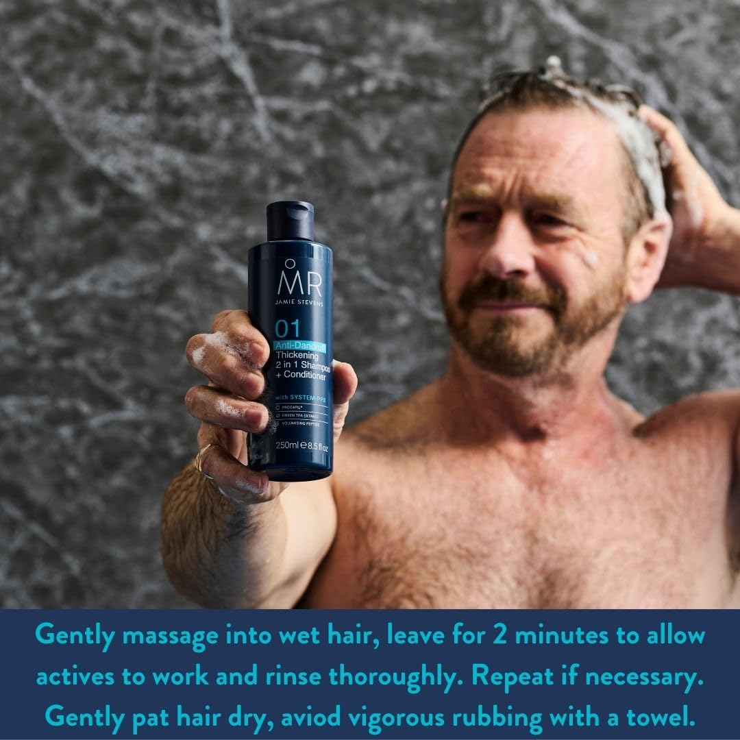 MR. Anti-Dandruff Thickening 2 in 1 Shampoo + Conditioner effectively helps to target the cause of dandruff whilst helping to revitalise weak roots. Boosted with a highly effective anti-dandruff agent to help calm the scalp and encourage healthier, thicker hair. With SYSTEM-PPX THICKENING COMPLEX PROCAPIL®: Helps boost the vitality and quality of hair. GREEN TEA EXTRACT: Helps support healthy hair. VOLUMISING PEPTIDE: Helps nourish and thicken the hair shaft.IngredientsBoosted with a highly effective anti-dandruff agent to help calm the scalp and encourage healthier, thicker hair.DirectionsMassage into hair and rinse thoroughly.Safety WarningFor external use only