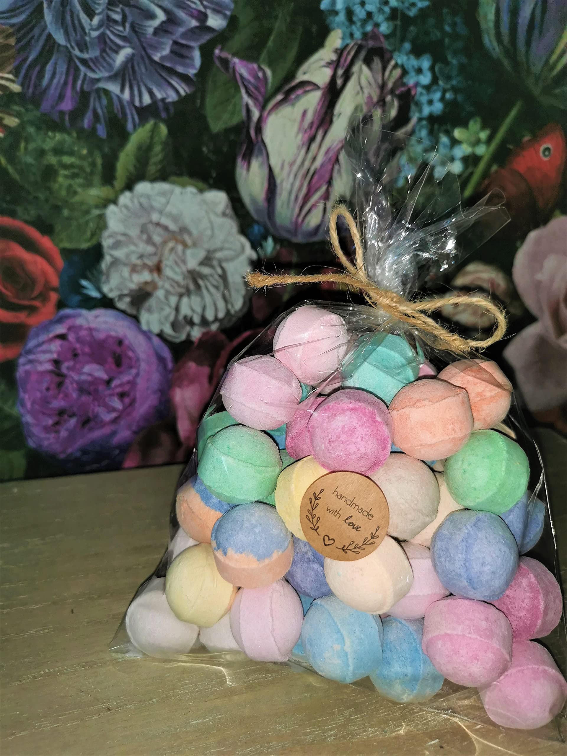 An assortment of 50 mini marble bath bombs Handmade in the UK using the finest possible ingredients You will receive a random assortment using a mix of the fragrances below The marbles will be gift wrapped in a cellophane bag, with a rustic string tie and label 2.5cm diameter, approx. 10g per marble Actual colours may slightly differ from the photographs Not tested on animals - Vegan friendly (CHOCOLATE ORANGE ISN'T VEGAN-PLEASE LEAVE A NOTE WITH YOUR ORDER IF YOU REQUIRE A VEGAN MIX) Coconut Milk (white) - Sodium Bicarbonate, Citric Acid, Parfum, Aqua, Hexyl Cinnamal, Coumarin. Raspberry (dark pink) - Sodium Bicarbonate, Citric Acid, Parfum, Aqua, CI 18050, Amyl Cinnamal. Peruvian Cherry (pink) - Sodium Bicarbonate, Citric Acid, Parfum, Aqua, CI 18050. Tropical Mango (orange) - Sodium Bicarbonate, Citric Acid, Parfum, Aqua, CI 14700, CI 16035, Citronellol, Geraniol. Blueberry (blue/purple) - Sodium Bicarbonate, Citric Acid, Parfum, Aqua, CI 42090, CI 17200, Benzyl Benzoate, Linalool. Snowmusk (white) - Sodium Bicarbonate, Citric Acid, Parfum, Aqua, Hydroxycitronellal. Damask Rose (light pink) - Sodium Bicarbonate, Citric Acid, Parfum, Aqua, CI 18050, Citronellol, Geraniol, Linalool. Passion Fruit (dark purple) - Sodium Bicarbonate, Citric Acid, Parfum, Aqua, CI 18050, CI 42090, Limonene. Wild Lavender (light purple) - Sodium Bicarbonate, Citric Acid, Parfum, Aqua, CI 17200, CI 42090, Linalool, Citronellol, Geraniol, Coumarin. Baby Powder (pink) - Sodium Bicarbonate, Citric Acid, Parfum, Aqua, CI 18050, Coumarin, Alpha-Isomethyl Ionone, Citronellol, Benzyl Benzoate, Cinnamyl Alcohol, Linalool. Ylang Ylang & Patchouli (cream) - Sodium Bicarbonate, Citric Acid, Parfum, Aqua, CI 17200, CI 19140, Linalool, Alpha-Isomethyl Ionone, Citronellol Jasmine (green) - Sodium Bicarbonate, Citric Acid, Parfum, Aqua, CI 19140, CI 42090, Hexyl Cinnamal, Benzyl Salicylate, Linalool. Seakay (blue) - Sodium Bicarbonate, Citric Acid, Parfum, Aqua, CI 42090, Linalool, Limonene, Butylphe