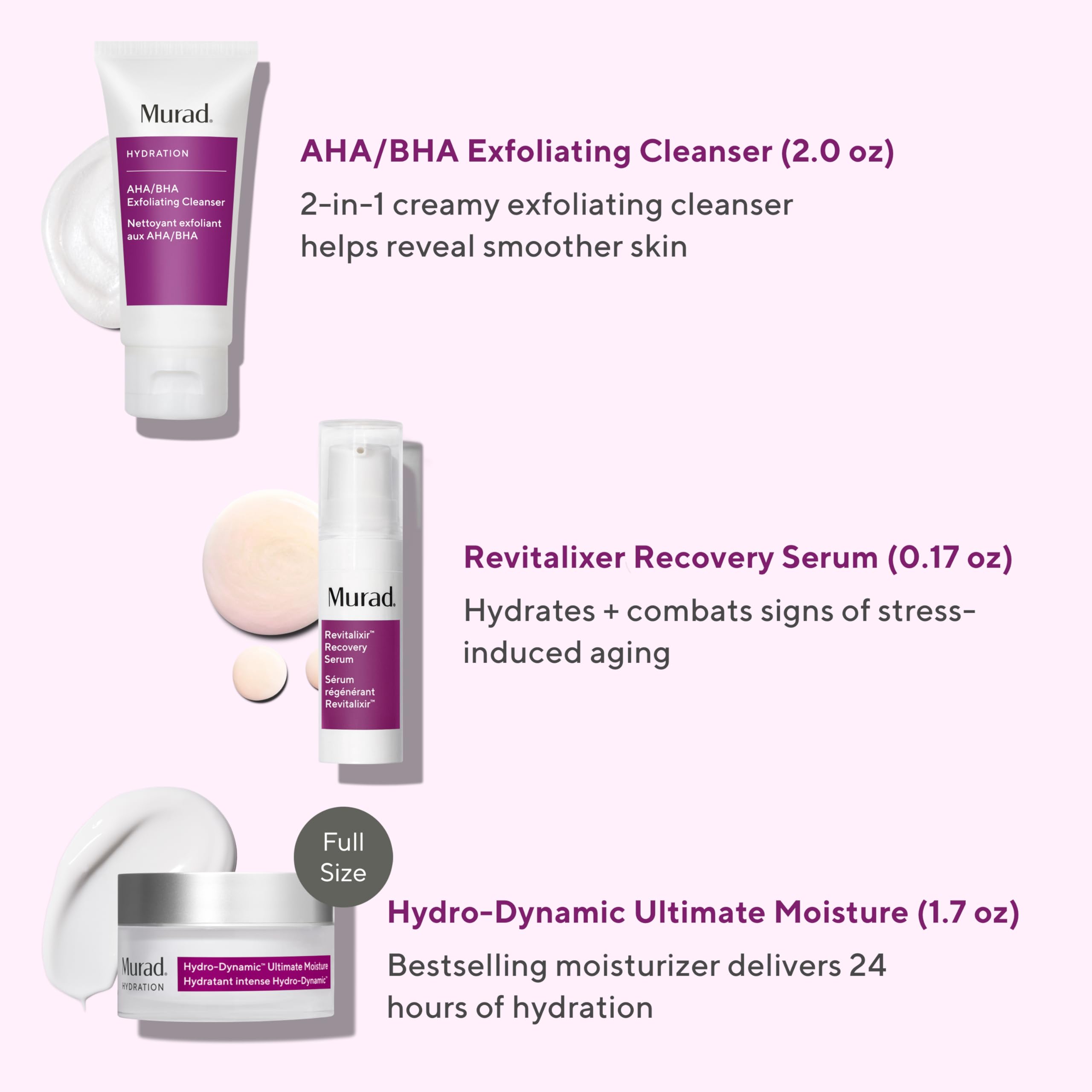 Set includes full size Hydro Dynamic Moisturizer and travel size Revitalixir Serum & AHA/BHA Cleanser for a hydration-loving trio that drenches skin in moisture.