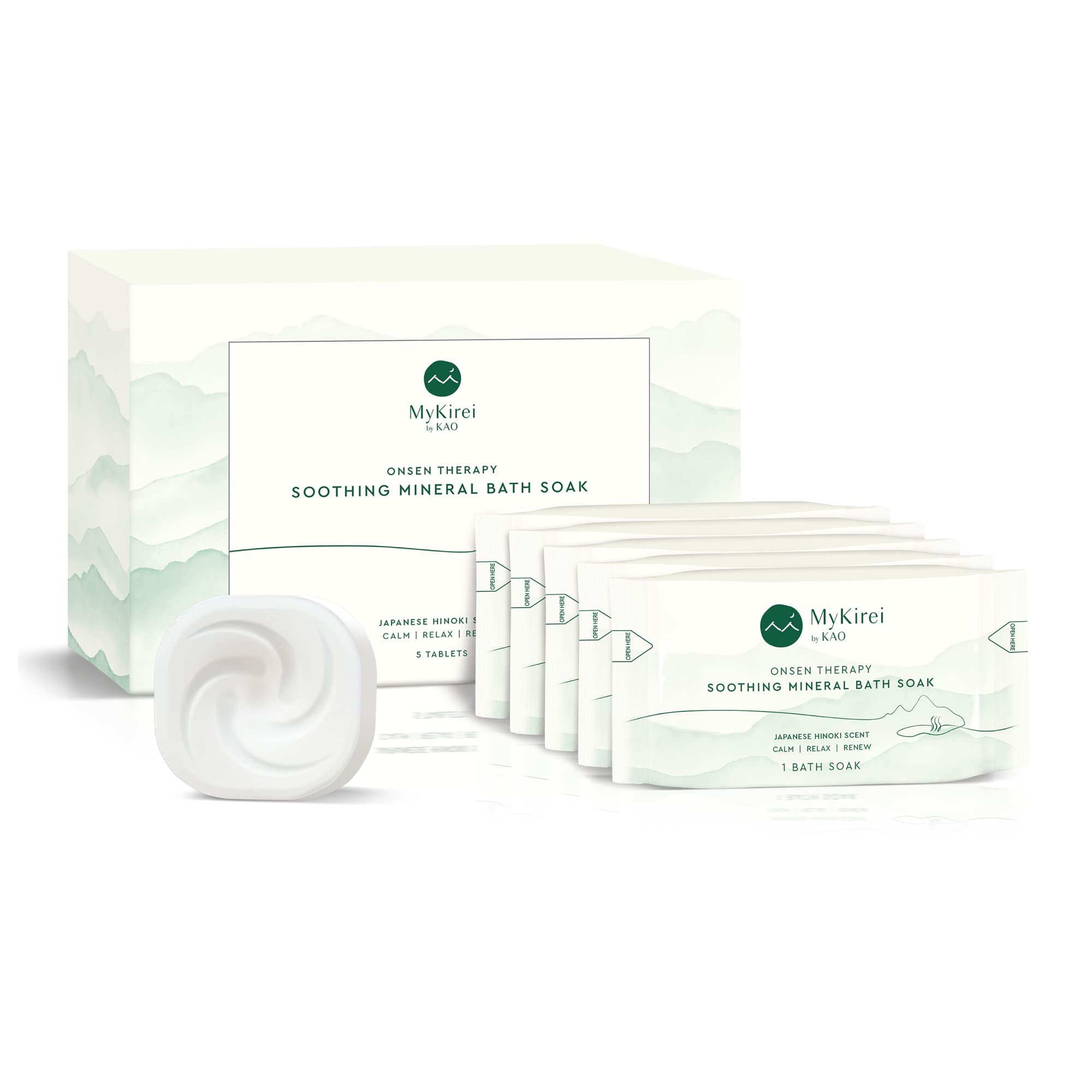 MyKirei by KAO Onsen Therapy Soothing Mineral Bath Soak is a bath tablet that combines steam, moisture, and minerals to relieve tired muscles, tension, stress, and strain to achieve a new level of well-being. This mineral bath soak is inspired by Japanese Onsen, the ritual of soaking in geo-thermal springs found in forests, and the rhythm of nature to heal and cleanse the body and soul. This bath bomb is rich in minerals and infused with a bright, woody fragrance of Japanese hinoki to help calm, relax, and rejuvenate. Use this mineral bath tablet to rejuvenate tired muscles and feet and ease stress and body tension, ideally before bed to achieve more restful sleep. Film pouches are 100% recyclable with TerraCycle.