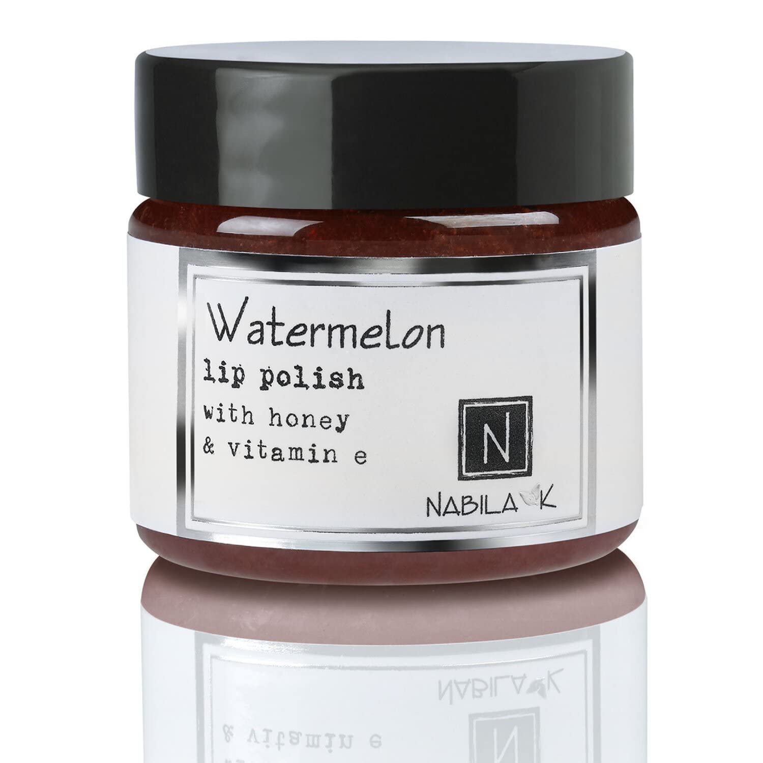 Pamper your lips for the holidays with Nabila K's Watermelon Lip Polish. Gently slough away dry, flaky skin to unveil lovely, healthy looking skin, leaving lips feeling soft and supple. This natural lip polish scrub, perfect for stuffing in a stocking, is made with safe, simple ingredients including sugar, watermelon powder, watermelon extract, beet extract, honey, agave nectar, shea butter, cocoa butter, and vitamin E. This scrub will exfoliate your lips without leaving them dry thanks to shea butter and vitamin E, which work together to moisturize and keep the skin from chapping. Nourish your lips and invest in time taking care of your skin to unveil the beauty within! Delight your senses with our slightly sweet, delicious lip scrubs that come in a variety of scents/flavors: Original Brown Sugar, Cherry, Chocolate, Coconut, Coffee, Lavender, Peppermint, Rose, Strawberry, Vanilla Cream, and Watermelon. Packaging is made of recycled plastic.Directions for use: Gently massage a pea-sized amount onto lips with fingertips for 1 to 2 minutes. Wipe off excess scrub with dry or moist towel. Follow up with Nabila K Lip Balm to lock in moisture and keep lips hydrated. Made in the USA.