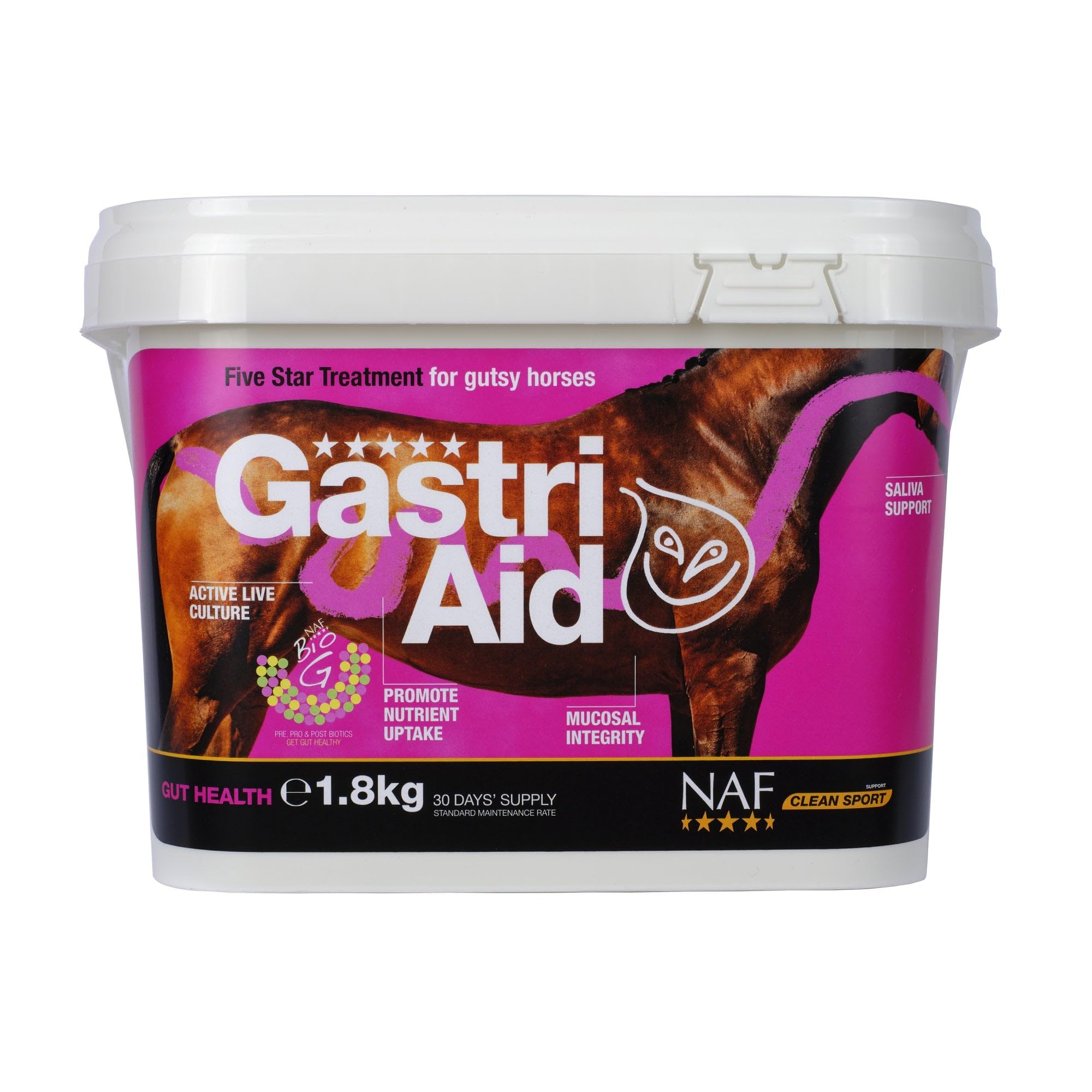 If your horse shows signs of gastric stress, feed this unique formulation to support the absence of ulcers and give him the stomach to perform. It gives daily protection from stress related gastric problems, defends the stomach wall from acid attack and h