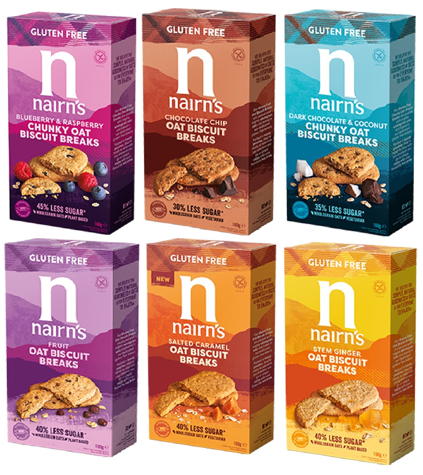 Nairn's Gluten Free Sweet Variety Pack - Choc Chip/Stem Ginger/Fruit/Salted Caramel/Blueberry & Raspberry Chunky Biscuit Breaks Etc. Pack of 6