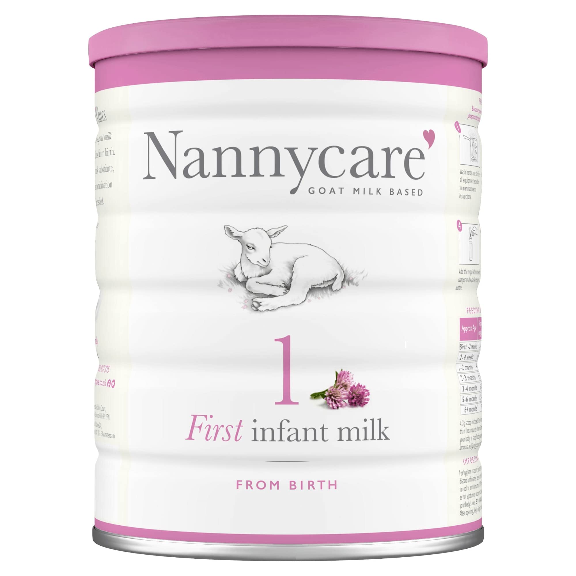 DescriptionProduct DescriptionNutritionally complete breast milk substitute. Nanny care Goat milk based formula suitable for infants from birth and can be used if your baby is not being breastfed, or to complement breastfeeding.Breastfeeding is best for babies. It is recommended that Nannycare First infant milk is used only on the advice of a doctor, midwife, health visitor, public health nurse, dietitian, pharmacist, or other professional responsible for maternal and child care.IngredientsPasteurised whole goat MILK, lactose (from MILK), vegetable oil blend (high oleic sunflower oil, rapeseed oil, sunflower oil, antioxidants (sunflower lecithin, tocopherol-rich extract)), pasteurised goat MILK powders, marine FISH oil powder (source of docosahexaenoic acid), Mortierella alpina oil powder (source of arachidonic acid), minerals, choline chloride, L-tyrosine, L-tryptophan, L-cystine, vitamins, L-isoleucine, taurine, L-carnitine. Vitamins: dl-α-tocopheryl acetate, L-ascorbic acid, nicotinamide, cholecalciferol, retinyl acetate, calcium D-pantothenate, cyanocobalamin, phytonadione, thiamin hydrochloride, riboflavin, pyridoxine hydrochloride, folic acid, D-biotin. Minerals: Sodium citrate, calcium citrate, calcium hydroxide, potassium chloride, ferrous sulphate, zinc sulphate, copper sulphate, manganese sulphate, potassium iodide, sodium selenite. This product contains 38% goat milk on a dry matter basis.DirectionsStore unopened can in a cool, dry place (do not refrigerate). After opening, keep airtight and continue to store in a cool, dry place. Use contents within 4 weeks. For best before date see base of pack. For storage conditions see side of pack.Safety WarningImportant Notice Breastfeeding is best for babies. It is recommended that NANNYcare® First infant milk is used only on the advice of a doctor, midwife, health visitor, public health nurse, dietitian, pharmacist, or other professional responsible for maternal and child care.Manufacturer Contact Information1A Bakery Court, 35-37 London End, Beaconsfield, Bucks HP9 2FN