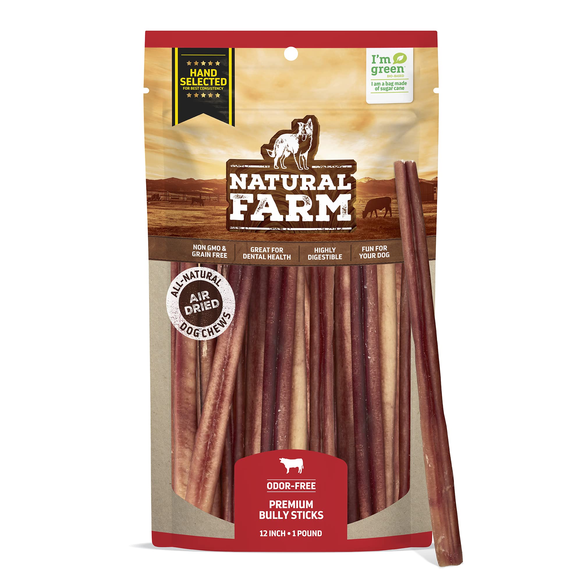 Choose the best and healthier dog treats for your best friend with Natural Farm Pet bully sticks crafted with genuine Angus beef! Your dog is your best friend. They go everywhere you go. Snuggle up when it’s time for movies. And love getting dirty when you’re having fun at the park. That’s why you want to give them the very best dog treats possible; especially when it comes to keeping them happy and healthy. We created Natural Farm Pet Angus Bully Sticks using free-range, grass-fed beef that is free of preservatives, chemicals, and additives to ensure they get the highest-quality treats possible. Great for training, reinforcing positive behavior, or just showing your dog how much you love them, they’re the perfect treat for dogs of all shapes and sizes. Healthy Dogs, Better Products Here at Natural Farm Pet we care as much about your four-legged friend as you do. We also care about the environment. That’s why our bully sticks are not only all-natural, 51% of the packaging is made from renewable sugar cane to help avoid traditional plastics made from fossil fuels. Important Safety Tips Please monitor your pet when they’re chewing on bully sticks and always provide fresh water. Ensure no big pieces are swallowed to help prevent choking. Product Details: Genuine Bully Sticks All-Natural Ingredients and Healthy Protein Small, Medium, and Large Breeds Supports Puppies, Adults, Seniors Promotes Good Dental Health No Hormones, Additives, or Preservatives Made in Brazil (Under Strict USDA and FDA Guidelines) Satisfaction Guaranteed Give your dog a healthy, natural treat as a reward or for training positive behavior; choose Natural Farm Pet Angus Bully Sticks today by clicking ‘Add to Cart’ above now.